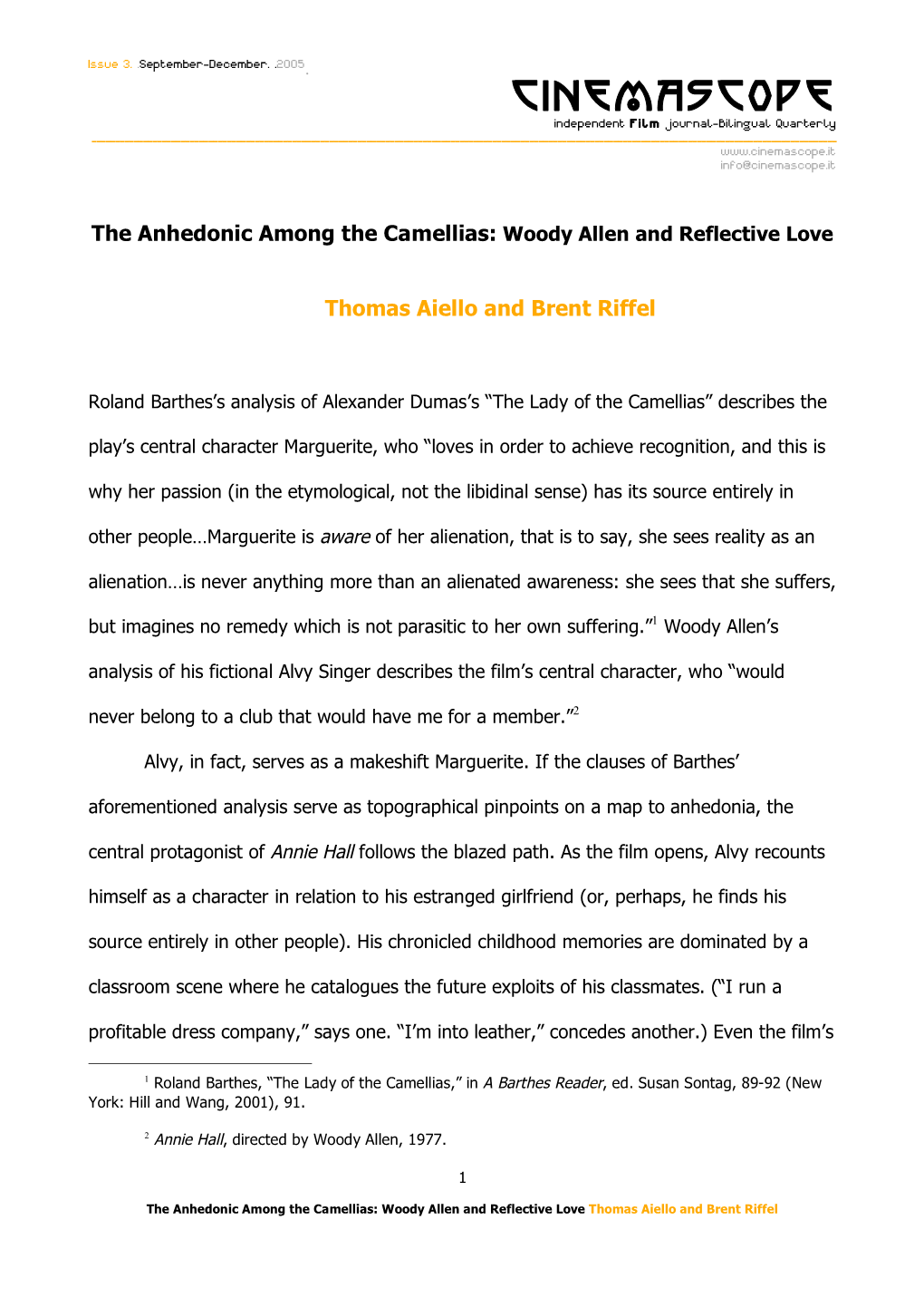 Referentiality and the Films of Woody Allen This page intentionally left blank Referentiality and the Films of Woody Allen Edited by Klara Stephanie Szlezák Passau University, Germany D. E. Wynter California State University, Northridge, USA Selection, introduction and editorial matter © Klara Stephanie Szlezák and D. E. Wynter 2015 Individual chapters © Respective authors 2015 Foreword © David Desser 2015 Softcover reprint of the hardcover 1st edition 2015 978-1-137-51546-9 All rights reserved. No reproduction, copy or transmission of this publication may be made without written permission. No portion of this publication may be reproduced, copied or transmitted save with written permission or in accordance with the provisions of the Copyright, Designs and Patents Act 1988, or under the terms of any licence permitting limited copying issued by the Copyright Licensing Agency, Saffron House, 6–10 Kirby Street, London EC1N 8TS. Any person who does any unauthorized act in relation to this publication may be liable to criminal prosecution and civil claims for damages. The authors have asserted their rights to be identified as the authors of this work in accordance with the Copyright, Designs and Patents Act 1988. First published 2015 by PALGRAVE MACMILLAN Palgrave Macmillan in the UK is an imprint of Macmillan Publishers Limited, registered in England, company number 785998, of Houndmills, Basingstoke, Hampshire RG21 6XS. Palgrave Macmillan in the US is a division of St Martin’s Press LLC, 175 Fifth Avenue, New York, NY 10010. Palgrave Macmillan is the global academic imprint of the above companies and has companies and representatives throughout the world. Palgrave® and Macmillan® are registered trademarks in the United States, the United Kingdom, Europe and other countries. -
