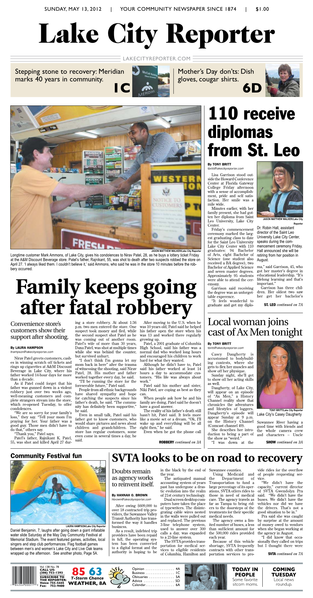 A3 SUNDAY, JULY 21, 2019 | YOUR COMMUNITY NEWSPAPER SINCE 1874 | $2 Lake City Reporter LAKECITYREPORTER.COM >> 3A SUNDAY + PLUS Young 1D farmers, Way ranchers: to go, ‘Ready, set, Kha’Maya grow’ Opinion/4A Travel Tales Statewide essay winner See 1C WOMAN SAYS Not quite back to normal Stalked 2A by gators, at City Hall — but nearly she can’t FAMILY MATTERS get help Big ones regulars in her Lake Montgomery backyard, she says. By CARL MCKINNEY COURTESY [email protected] A leak resulting from a Friday after- noon rainstorm caused a mess for Camille Souza says her back- Sakura Buffet in the Lake City Mall. yard is like a killing field — any unfortunate creature that ven- tures out there stands a chance of ending up as breakfast, lunch or dinner for the carnivores Storm lurking about. Souza first ‘A 10-foot- noticed the alli- er and gators in April swamps eight-footer, and has tried Photos by MICHAEL PHILIPS/Lake City Reporter those are to get them the two removed ever I’m having since, but says Family buffet a problem the catcher con- with,’ Souza tracted by wild- says. life officials has History been giving her in mall the runaround. Day at “I’m too afraid to even go back Rainwater pours through there and mow,” she said. ceiling, drenching eatery Souza lives on Short Lane by LDS and surrounding area. Lake Montgomery. “I understand it’s Florida. I Church opens its By TONY BRITT and MICHAEL PHILIPS live on a lake,” she said. “But database up to all, lakecityreporter.com still, I want the alligators gone.” offers expert help. -