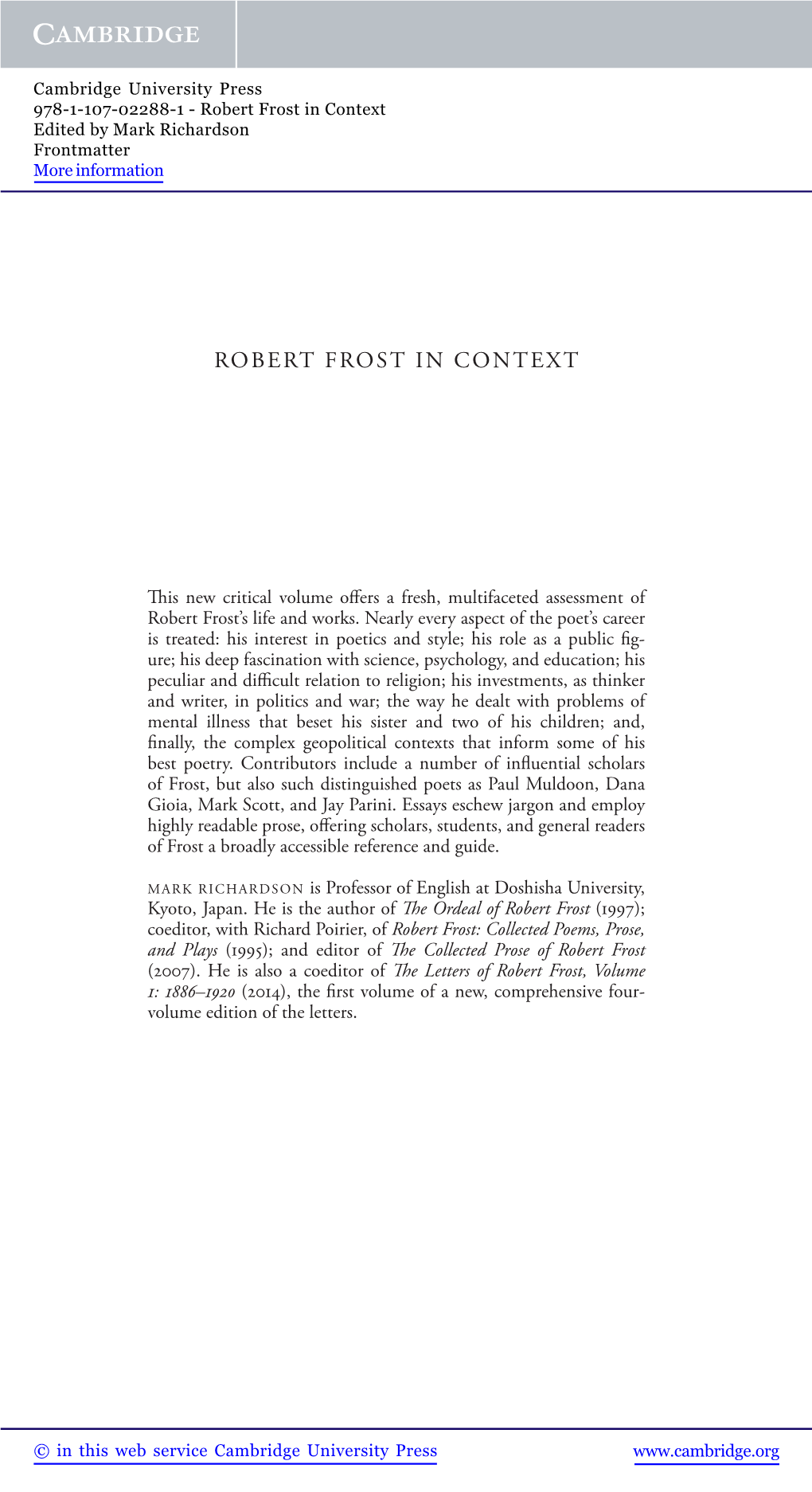 Robert Frost in Context Edited by Mark Richardson Frontmatter More Information