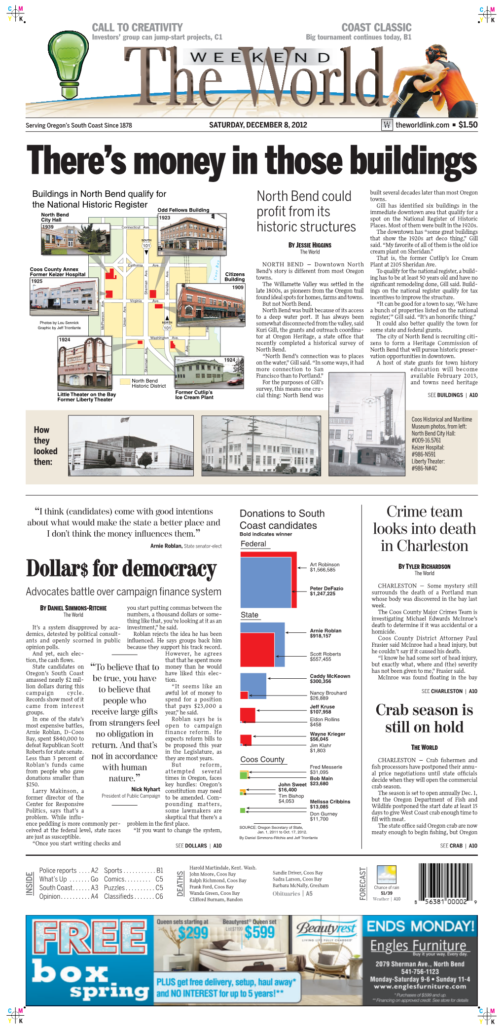 C M C M Y K Y K ARMED OFFICERS IN SCHOOLS BANDON DUNES INVITE NRA breaks its silence on mass shootings, A9 Tigers girls beat Jefferson, B1 Serving Oregon’s South Coast Since 1878 SATURDAY, DECEMBER 22, 2012 theworldlink.com I $1.50 In the wake of Sandy Hook No rush to tighten gun laws Doug Hille looks up BY DANIEL SIMMONS-RITCHIE items on a laptop, The World searching for ammo for a cus- Gun control? ‘Slow down’, say a handful of South tomer Friday at the Coast officials. Hole in the Wall In the wake of last week’s shootings in Clacka- Gun Shop in Coos mas and Connecticut, local politicos are treading Bay. Many items cautiously as the nation examines tightening gun readily available a laws. week ago are not Congressman Peter DeFazio, D-Eugene, says this week. mass shootings is a complex subject that requires a “comprehensive approach.” “This is an issue fraught with emotions and mis- understanding,” he said. “There are liberals from New York who have never held a gun, fired a gun. They don’t understand guns; they don’t under- stand why someone would have a gun.They want to ban all guns essentially.” DeFazio owns several guns for target shooting and self-protection. He says he supports restric- tions on certain firearms, but wouldn’t say whether he supports a ban on assault rifles, like the Bush- master AR-15 used by Adam Lanza to kill 20 chil- dren at Sandy Hook Elementary school. “There are clearly some very stupid guns out there, designed for — I’m not sure what they are designed for,” DeFazio said. -