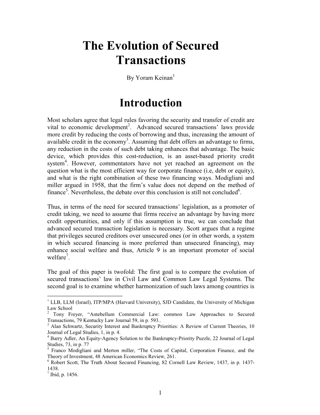 Secured Financing and Priorities Among Creditors* Thomas H. Jacksont and Anthony T. Kronmant One of the principal advantages of a secured transaction is the protection it provides against the claims of competing creditors. A creditor asserting a security interest in his debtor's property is likely to find himself in competition with a wide assortment of other claimants. For example, his security interest may be challenged by another creditor with a consensual security interest, by a creditor with a judgment or execution lien, by a creditor claiming a right to the collateral under some general statutory entitlement such as a repair- man's lien, by a seller to or a buyer from the debtor, or by the debtor's trustee in bankruptcy. To a considerable extent, the value of a security interest depends upon the degree to which it insulates the secured party from the claims of the debtor's other creditors.1 Article 9 of the Uniform Commercial Code contains detailed rules for resolving conflicts between secured creditors and various third parties-rules that tell the secured party what he must do in order to prevent his security interest from being overridden by a competing claimant, or, conversely, what a competitor must do in order to cir- cumvent an existing security interest in the debtor's property. These rules are called "priority" rules since it is their function to determine * The authors wish to thank Bruce Ackerman, Paul Bator, Ven Countryman, Alvin Klevorick, James Krier, William Landes, Richard Posner, George Priest, Kenneth Scott, Alan Schwartz, and the participants at the Law and Economics Workshops at the State University of New York at Buffalo and the University of Chicago for their helpful com- ments on an earlier draft of this article. -