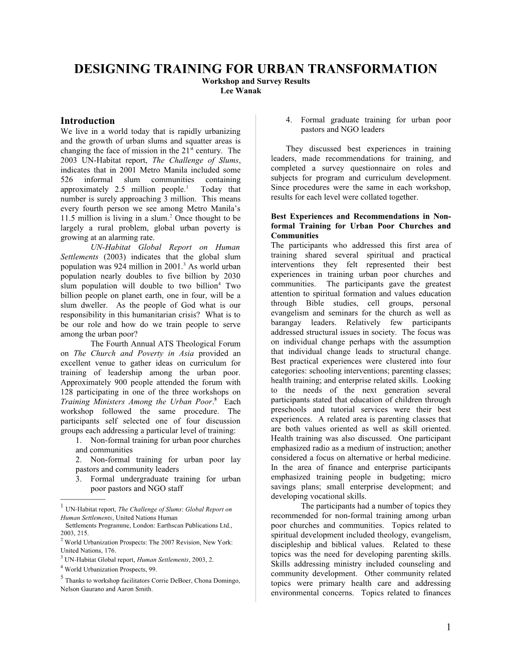 Introduction 4. Formal graduate training for urban poor We live in a world today that is rapidly urbanizing pastors and NGO leaders and the growth of urban slums and squatter areas is changing the face of mission in the 21st century. The They discussed best experiences in training 2003 UN-Habitat report, The Challenge of Slums, leaders, made recommendations for training, and indicates that in 2001 Metro Manila included some completed a survey questionnaire on roles and 526 informal slum communities containing subjects for program and curriculum development. approximately 2.5 million people.1 Today that Since procedures were the same in each workshop, number is surely approaching 3 million. This means results for each level were collated together. every fourth person we see among Metro Manila’s 11.5 million is living in a slum.2 Once thought to be Best Experiences and Recommendations in Non- largely a rural problem, global urban poverty is formal Training for Urban Poor Churches and growing at an alarming rate. Communities UN-Habitat Global Report on Human The participants who addressed this first area of Settlements (2003) indicates that the global slum training shared several spiritual and practical population was 924 million in 2001.3 As world urban interventions they felt represented their best population nearly doubles to five billion by 2030 experiences in training urban poor churches and slum population will double to two billion4 Two communities. The participants gave the greatest billion people on planet earth, one in four, will be a attention to spiritual formation and values education slum dweller. As the people of God what is our through Bible studies, cell groups, personal responsibility in this humanitarian crisis? What is to evangelism and seminars for the church as well as be our role and how do we train people to serve barangay leaders. Relatively few participants among the urban poor? addressed structural issues in society. The focus was The Fourth Annual ATS Theological Forum on individual change perhaps with the assumption on The Church and Poverty in Asia provided an that individual change leads to structural change. excellent venue to gather ideas on curriculum for Best practical experiences were clustered into four training of leadership among the urban poor. categories: schooling interventions; parenting classes; Approximately 900 people attended the forum with health training; and enterprise related skills. Looking 128 participating in one of the three workshops on to the needs of the next generation several Training Ministers Among the Urban Poor.5 Each participants stated that education of children through workshop followed the same procedure. The preschools and tutorial services were their best participants self selected one of four discussion experiences. A related area is parenting classes that groups each addressing a particular level of training: are both values oriented as well as skill oriented. 1. Non-formal training for urban poor churches Health training was also discussed. One participant and communities emphasized radio as a medium of instruction; another 2. Non-formal training for urban poor lay considered a focus on alternative or herbal medicine. pastors and community leaders In the area of finance and enterprise participants 3. Formal undergraduate training for urban emphasized training people in budgeting; micro poor pastors and NGO staff savings plans; small enterprise development; and developing vocational skills. 1 UN-Habitat report, The Challenge of Slums: Global Report on The participants had a number of topics they Human Settlements, United Nations Human recommended for non-formal training among urban Settlements Programme, London: Earthscan Publications Ltd., poor churches and communities. Topics related to 2003, 215. spiritual development included theology, evangelism, 2 World Urbanization Prospects: The 2007 Revision, New York: discipleship and biblical values. Related to these United Nations, 176. topics was the need for developing parenting skills. 3 UN-Habitat Global report, Human Settlements, 2003, 2. Skills addressing ministry included counseling and 4 World Urbanization Prospects, 99. 5 community development. Other community related Thanks to workshop facilitators Corrie DeBoer, Chona Domingo, topics were primary health care and addressing Nelson Gaurano and Aaron Smith. environmental concerns. Topics related to finances