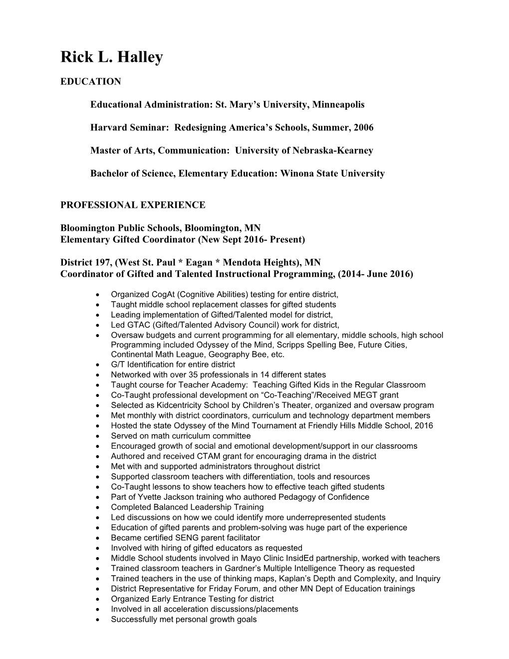 Organized CogAt (Cognitive Abilities) testing for entire district, Taught middle school replacement classes for gifted students Leading implementation of Gifted/Talented model for district, Led GTAC (Gifted/Talented Advisory Council) work for district, Oversaw budgets and current programming for all elementary, middle schools, high school Programming included Odyssey of the Mind, Scripps Spelling Bee, Future Cities, Continental Math League, Geography Bee, etc. G/T Identification for entire district Networked with over 35 professionals in 14 different states Taught course for Teacher Academy: Teaching Gifted Kids in the Regular Classroom Co-Taught professional development on “Co-Teaching”/Received MEGT grant Selected as Kidcentricity School by Children’s Theater, organized and oversaw program Met monthly with district coordinators, curriculum and technology department members Hosted the state Odyssey of the Mind Tournament at Friendly Hills Middle School, 2016 Served on math curriculum committee Encouraged growth of social and emotional development/support in our classrooms Authored and received CTAM grant for encouraging drama in the district Met with and supported administrators throughout district Supported classroom teachers with differentiation, tools and resources Co-Taught lessons to show teachers how to effective teach gifted students Part of Yvette Jackson training who authored Pedagogy of Confidence Completed Balanced Leadership Training Led discussions on how we could identify more underrepresented students Education of gifted parents and problem-solving was huge part of the experience Became certified SENG parent facilitator Involved with hiring of gifted educators as requested Middle School students involved in Mayo Clinic InsidEd partnership, worked with teachers Trained classroom teachers in Gardner’s Multiple Intelligence Theory as requested Trained teachers in the use of thinking maps, Kaplan’s Depth and Complexity, and Inquiry District Representative for Friday Forum, and other MN Dept of Education trainings Organized Early Entrance Testing for district Involved in all acceleration discussions/placements Successfully met personal growth goals Increased oversight of high school gifted students, including social/emotional support Trained in Genius Hour Received grant for Professional Development of our staff in Total School-wide Clustering And Social and Emotional Needs of Gifted Students