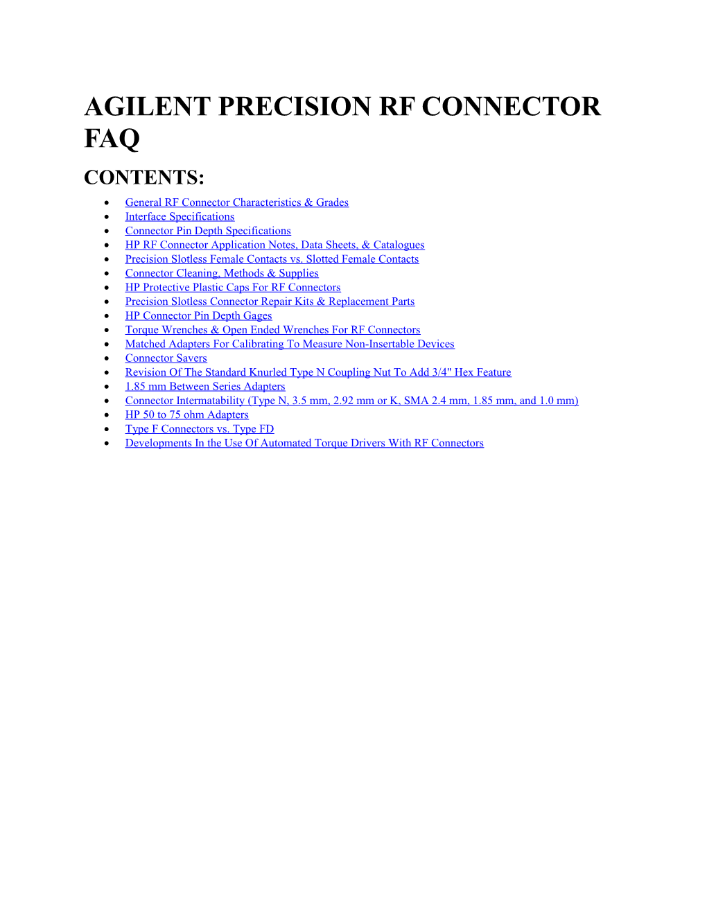 AGILENT PRECISION RF CONNECTOR FAQ CONTENTS: General RF Connector Characteristics & Grades Interface Specifications Connector Pin Depth Specifications HP RF Connector Application Notes, Data Sheets, & Catalogues Precision Slotless Female Contacts vs. Slotted Female Contacts Connector Cleaning, Methods & Supplies HP Protective Plastic Caps For RF Connectors Precision Slotless Connector Repair Kits & Replacement Parts HP Connector Pin Depth Gages Torque Wrenches & Open Ended Wrenches For RF Connectors Matched Adapters For Calibrating To Measure Non-Insertable Devices Connector Savers Revision Of The Standard Knurled Type N Coupling Nut To Add 3/4" Hex Feature 1.85 mm Between Series Adapters Connector Intermatability (Type N, 3.5 mm, 2.92 mm or K, SMA 2.4 mm, 1.85 mm, and 1.0 mm) HP 50 to 75 ohm Adapters Type F Connectors vs. Type FD Developments In the Use Of Automated Torque Drivers With RF Connectors General RF Connector Characteristics and Grades Min Upper Instrumen Coupling Torque Metrology Production Connector Oper. Freq Sexed t (N-cm/in-lb.) Grade 1 Grade3 (GHz) Grade2 7 mm (APC-7*) 18 135/12 N Y Y Y Type N 50 ohm 18 135/12 Y Y Y Y Type N 75 ohm 184 135/12 Y Y5 Y Y 3.5 mm 33 90/8 Y Y Y Y7 2.92 mm (K*) 40 90/8 Y N Y Y 2.4 mm 50 90/8 Y Y Y Y 1.85 mm 65 90/8 Y Y5 Y Y 1.0 mm 110 34/3 Y N Y Y SMA 186 56/5 Y Y7 Y7 Y TNC 118 56/5 Y N N Y BNC 3 N/A Y N N Y SMC 4 34-45/3-4 Y N N Y Type F (75 ohm) 1 168/15 Y N N Y Type FD 39 168/15 Y Y5 Y Y Type 7-16 7.5 2500-3000/222-26710 Y N Y Y Notes: 1. Metrology grade connectors use precision slotless contacts. This grade uses the tightest tolerances to achieve the best performance. 2. Instrument grade connectors other than the 7 mm use slotted female center conductors. The tolerances are tight and the performance is very good. 3. Production grade connectors are lower cost connectors with moderate performance. 4. Theoretically Type N 75 ohm doesn't mode until about 18 GHz, but the HP 85036B 75 ohm Type N Calibration Kit is only specified up to 3 GHz. 5. Metrology Grade components for these connector styles have been developed by HP for internal test purposes, but they are not readily available. 6. Many SMAs have a maximum frequency of 18 GHz, but some manufacturers specify the performance of some of their SMA product line up to around 27 GHz. 7. The SMA connector is considered the Production Grade version of the 3.5 mm just as the 3.5 mm connector provides the Instrument and Metrology Grades for the SMA. 8. IEC 169-17 describes TNCs with either a 11 GHz or 16 GHz maximum frequency, but the expectation for many cable connectors is that they will only work up to 3 GHz. IEC 169-26 specifies a TNC with an 18 GHz maximum frequency. 9. The EIA-550 Standard that specifies the Type FD connector calls out 1.5 GHz as the maximum frequency, but the HP 85039A Type F Calibration Kit is specified up to 3 GHz. 10. This is not a misprint, CECC 22190 specifies the 7-16 connector coupling torque at 25 to 30 Nm (~ 20 ft- lbs.). * APC-7 is a registered trademark of Amphenol Corporation. K is a registered trademark of Wiltron Corporation.