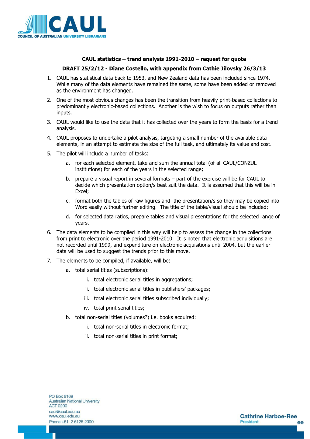 CAUL statistics – trend analysis 1991-2010 – request for quote DRAFT 25/2/12 - Diane Costello, with appendix from Cathie Jilovsky 26/3/13 1. CAUL has statistical data back to 1953, and New Zealand data has been included since 1974. While many of the data elements have remained the same, some have been added or removed as the environment has changed. 2. One of the most obvious changes has been the transition from heavily print-based collections to predominantly electronic-based collections. Another is the wish to focus on outputs rather than inputs. 3. CAUL would like to use the data that it has collected over the years to form the basis for a trend analysis. 4. CAUL proposes to undertake a pilot analysis, targeting a small number of the available data elements, in an attempt to estimate the size of the full task, and ultimately its value and cost. 5. The pilot will include a number of tasks: a. for each selected element, take and sum the annual total (of all CAUL/CONZUL institutions) for each of the years in the selected range; b. prepare a visual report in several formats – part of the exercise will be for CAUL to decide which presentation option/s best suit the data. It is assumed that this will be in Excel; c. format both the tables of raw figures and the presentation/s so they may be copied into Word easily without further editing. The title of the table/visual should be included; d. for selected data ratios, prepare tables and visual presentations for the selected range of years. 6. The data elements to be compiled in this way will help to assess the change in the collections from print to electronic over the period 1991-2010. It is noted that electronic acquisitions are not recorded until 1999, and expenditure on electronic acquisitions until 2004, but the earlier data will be used to suggest the trends prior to this move. 7. The elements to be compiled, if available, will be: a. total serial titles (subscriptions): i. total electronic serial titles in aggregations; ii. total electronic serial titles in publishers’ packages; iii. total electronic serial titles subscribed individually; iv. total print serial titles; b. total non-serial titles (volumes?) i.e. books acquired: i. total non-serial titles in electronic format; ii. total non-serial titles in print format; c. expenditure on library materials: i. expenditure on electronic materials: 1. expenditure on electronic books; 2. expenditure on electronic serials; ii. expenditure on print materials: 1. expenditure on print books; 2. expenditure on print serials; d. total loans; e. total inter-library loans received: i. total returnable inter-library loans received; ii. total non-returnable inter-library loans received; 8. The ratios are to be determined but might include: a. how has the cost per book acquired changed? b. how has the cost per serial subscription changed? c. what proportion of materials expenditure is spent on electronic vs print? d. what proportion of materials expenditure is spent on serials vs books? 9. CAUL would like to invite xxxx to quote for the compilation of the requested format suitable for easy copying into Word documents. The tables and visual presentations should be in a form that is easily updated when the new year’s data becomes available. The data analyst may make observations on the data, but it is expected that the commentary on the trend data will be prepared by someone with a good understanding of the changes in libraries in universities over the period under examination. 10. The timeframe is negotiable.