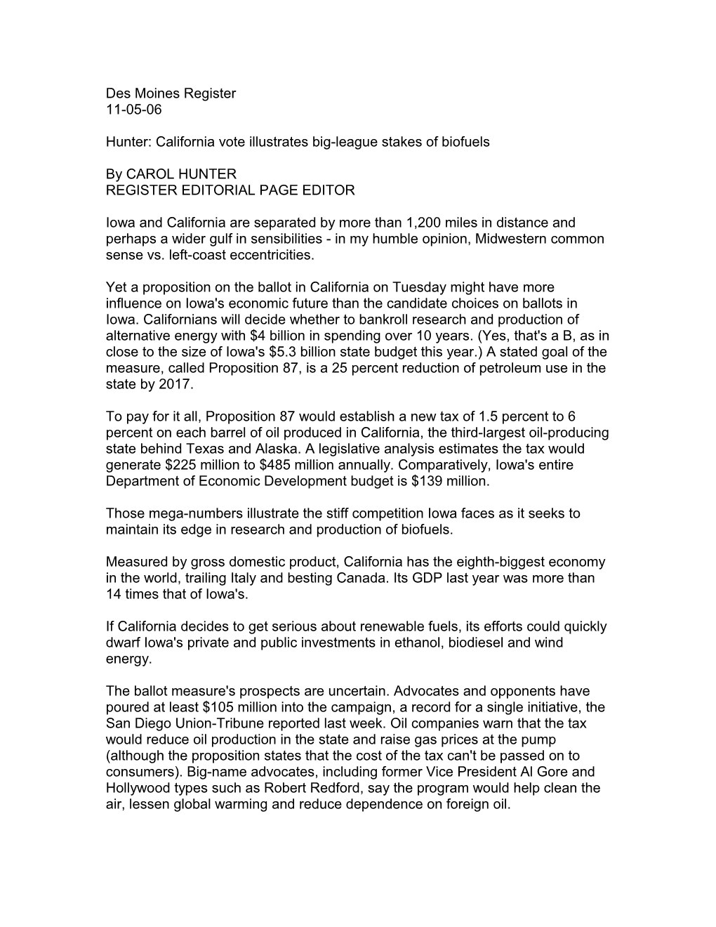 Yet a proposition on the ballot in California on Tuesday might have more influence on Iowa's economic future than the candidate choices on ballots in Iowa. Californians will decide whether to bankroll research and production of alternative energy with $4 billion in spending over 10 years. (Yes, that's a B, as in close to the size of Iowa's $5.3 billion state budget this year.) A stated goal of the measure, called Proposition 87, is a 25 percent reduction of petroleum use in the state by 2017.