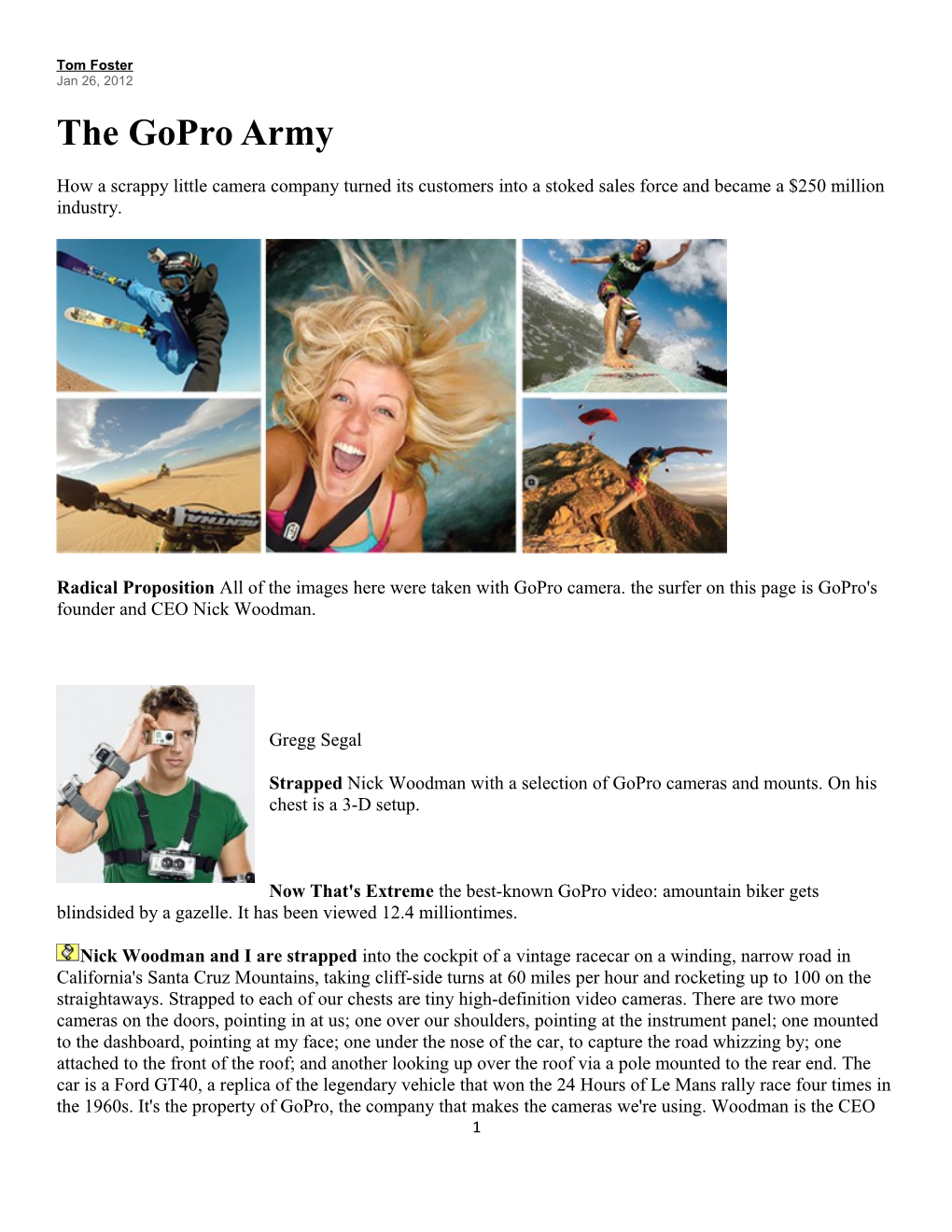 At this point, you've almost certainly seen video that came from a GoPro camera, even if you didn't know it. A Facebook friend might have shared the clip of a mountain biker in Africa being flattened by a sprinting gazelle; it has drawn 12.4 million views on YouTube since going viral in October. Or maybe you saw the bird's-eye- view video of a seagull picking up a camera and making off with it (2.8 million views) or a skier touching off an avalanche in the Alps and flying away from it with a parachute (2.1 million views). Every two or three minutes, a new piece of GoPro–created content is uploaded to YouTube, and Woodman credits those videos— whether produced by its army of customers or by the company's 20-person in-house media team—with much of the company's runaway success.