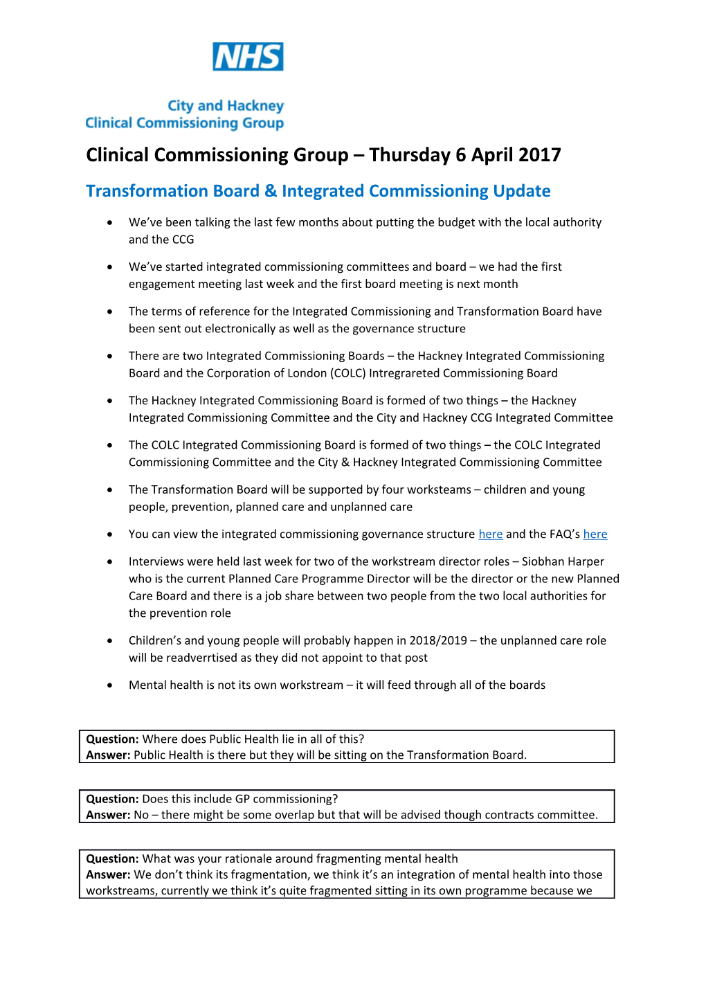 Question: Where does Public Health lie in all of this? Answer: Public Health is there but they will be sitting on the Transformation Board.