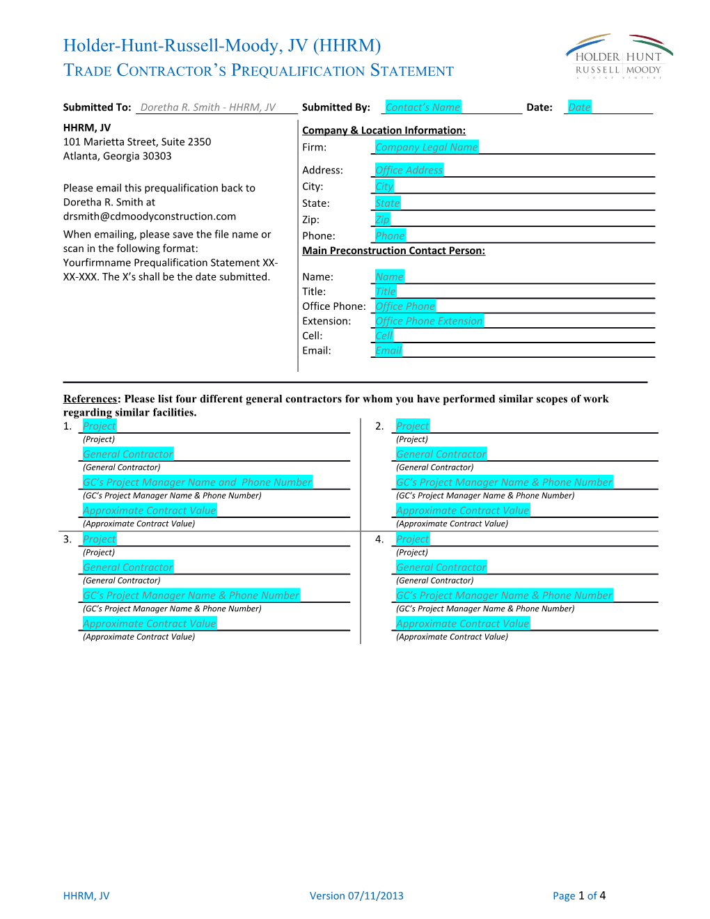 HHRM, JV Version 07/11/2013 Page 1 of 4 Holder-Hunt-Russell-Moody, JV (HHRM) TRADE CONTRACTOR’S PREQUALIFICATION STATEMENT