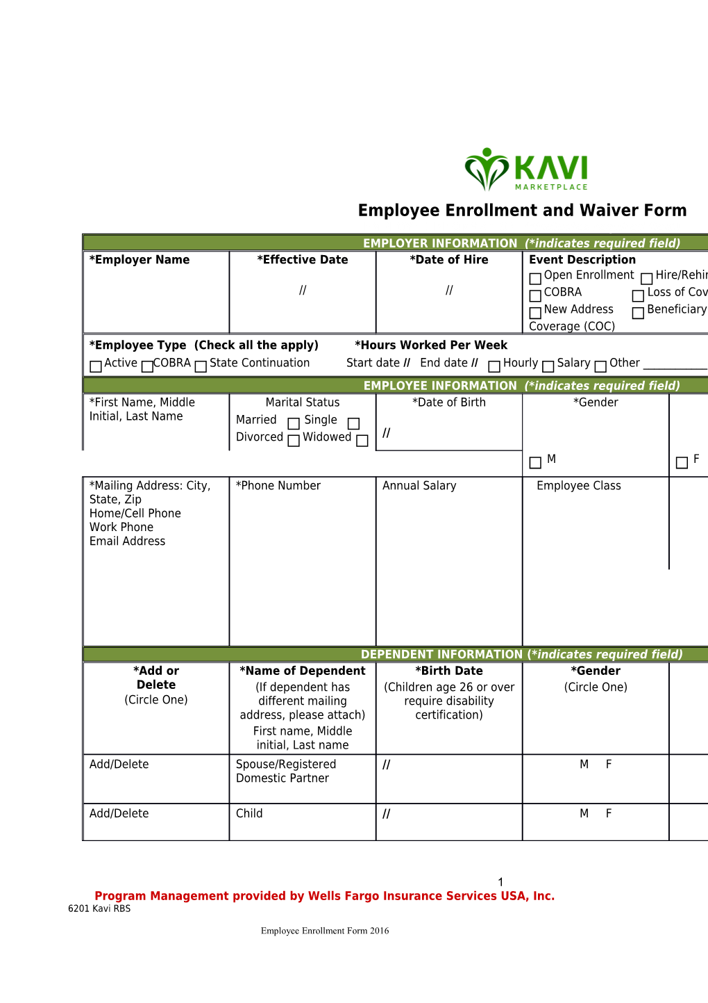 Employee Enrollment and Waiver Form EMPLOYEE INFORMATION (*indicates required field) EMPLOYER INFORMATION (*indicates required field) *Employer Name *Effective Date *Date of Hire Event Description Open Enrollment Hire/Rehire // // COBRA Loss of Coverage New Address Beneficiary Coverage (COC) *Employee Type (Check all the apply) *Hours Worked Per Week Active COBRA State Continuation Start date // End date // Hourly Salary Other ______EMPLOYEE INFORMATION (*indicates required field) *First Name, Middle Marital Status *Date of Birth *Gender Initial, Last Name Married Single Divorced Widowed // M F
