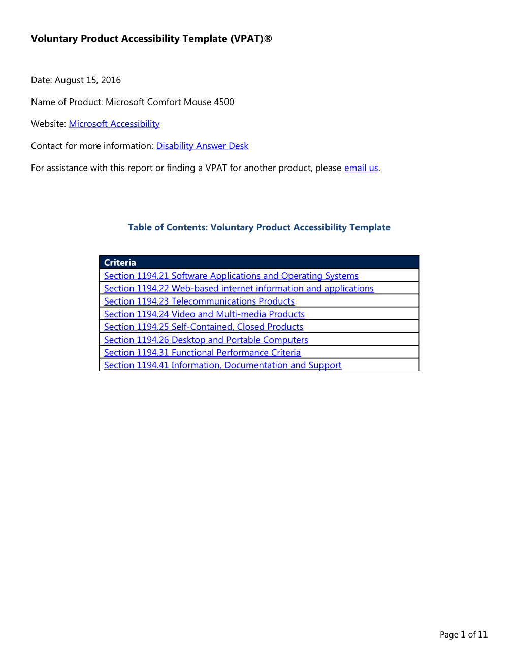 Page 10 of 11 Criteria Supporting Feature Remarks and Explanations (a) Product support documentation provided to Supported end-users shall be made available in alternate formats upon request, at no additional charge (b) End-users shall have access to a description of Supported the accessibility and compatibility features of products in alternate formats or alternate methods upon request, at no additional charge. (c) Support services for products shall Supported Microsoft offers support to accommodate the communication needs of end- accommodate our customers users with disabilities. with disabilities through the Disability Answer Desk.