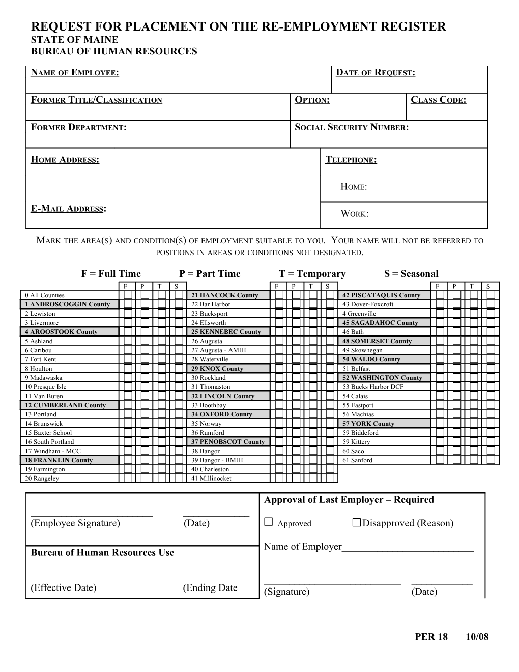 REQUEST FOR PLACEMENT ON THE RE-EMPLOYMENT REGISTER STATE OF MAINE BUREAU OF HUMAN RESOURCES
