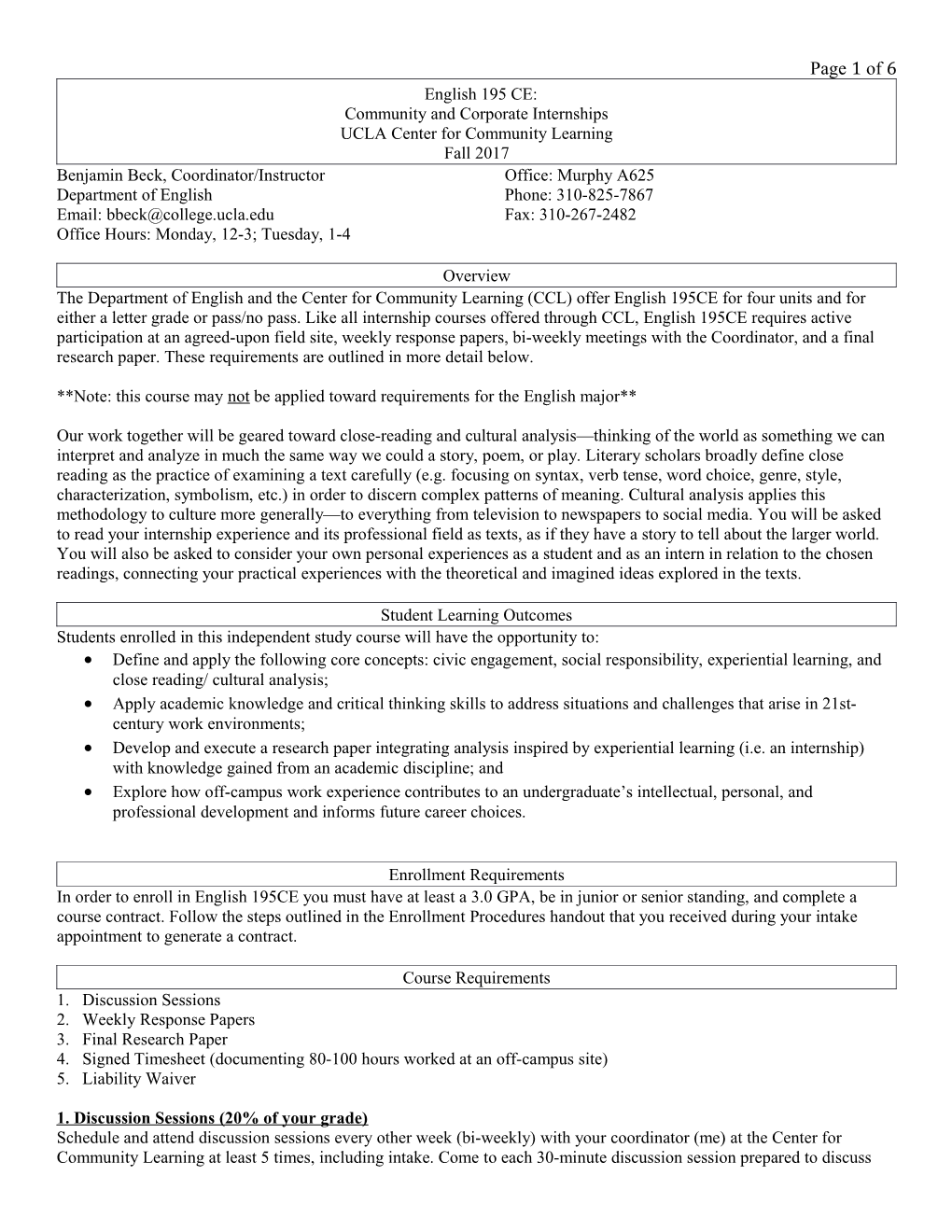 Page 1 of 6 English 195 CE: Community and Corporate Internships UCLA Center for Community Learning Fall 2017 Benjamin Beck, Coordinator/Instructor Office: Murphy A625 Department of English Phone: 310-825-7867 Email: [email protected] Fax: 310-267-2482 Office Hours: Monday, 12-3; Tuesday, 1-4