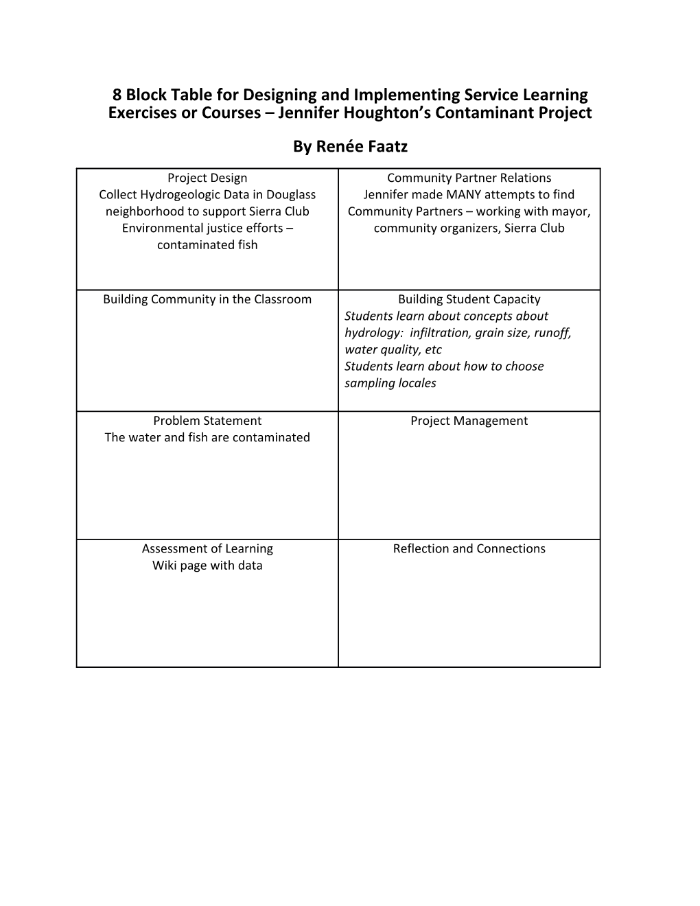 8 Block Table for Designing and Implementing Service Learning Exercises or Courses – Jennifer Houghton’s Contaminant Project By Renée Faatz