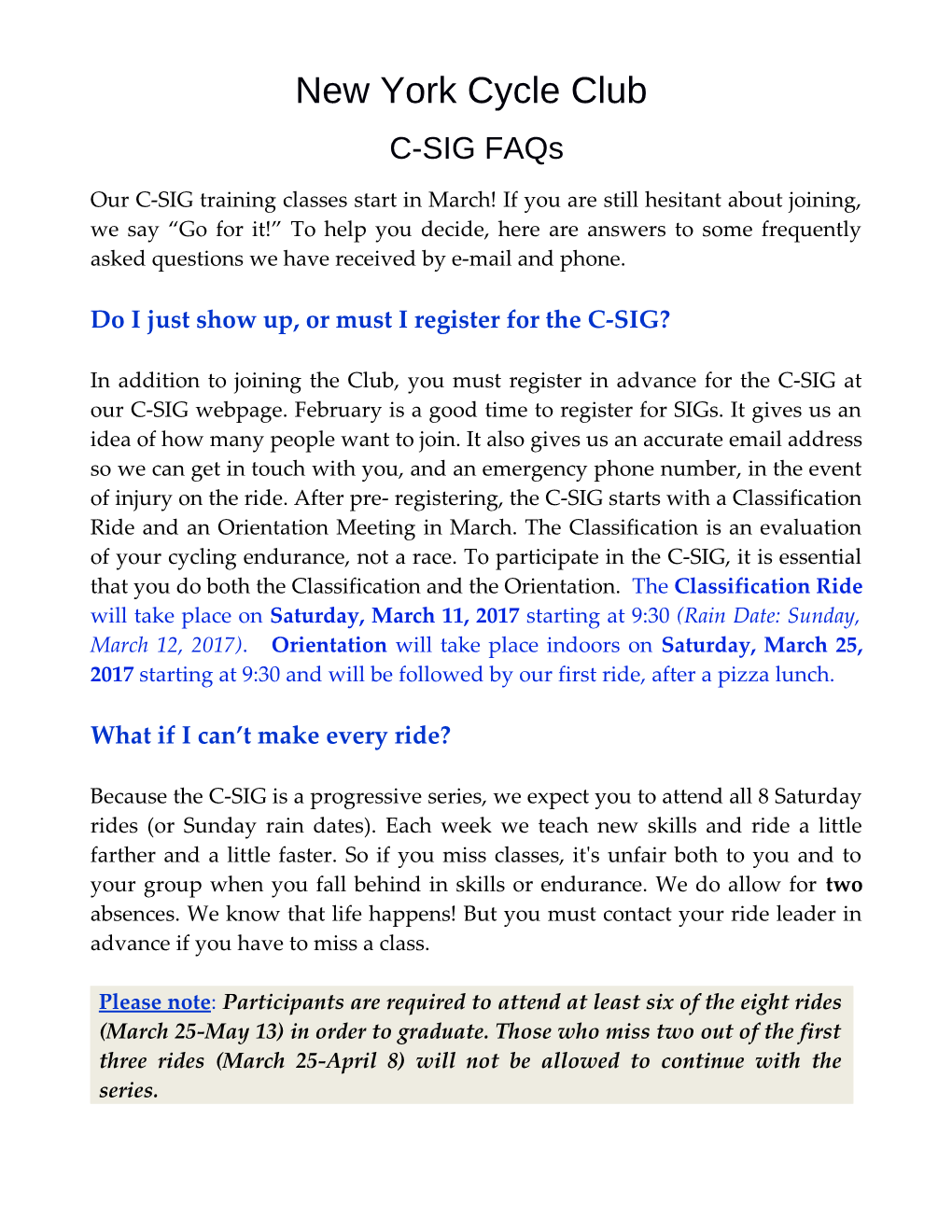 The speed of the fastest C-SIG group is usually approximately the same as the slowest B-SIG group, but with less distance and fewer hills as appropriate for a novice. Keep in mind that, due to demand, you can only do the C-SIG once. Many graduates of both C- and B-SIGS participate in the various century and other events over the summer, as well as the numerous weekly NYCC rides.