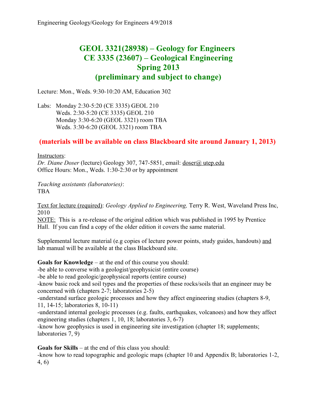 GEOL 3321(28938) – Geology for Engineers CE 3335 (23607) – Geological Engineering Spring 2013 (preliminary and subject to change)