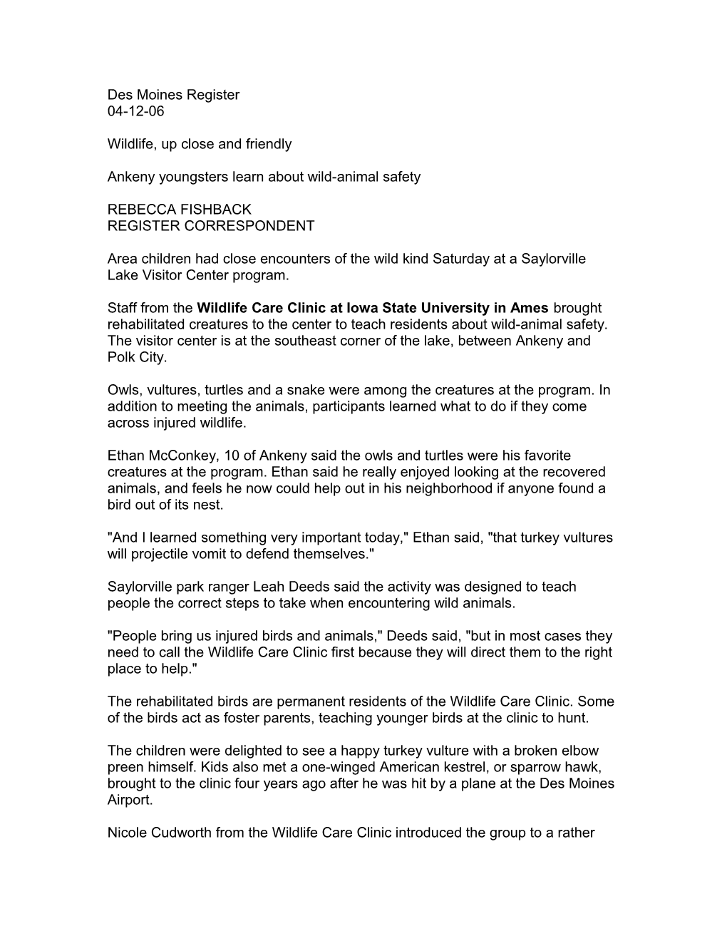 Staff from the Wildlife Care Clinic at Iowa State University in Ames brought rehabilitated creatures to the center to teach residents about wild-animal safety. The visitor center is at the southeast corner of the lake, between Ankeny and Polk City.