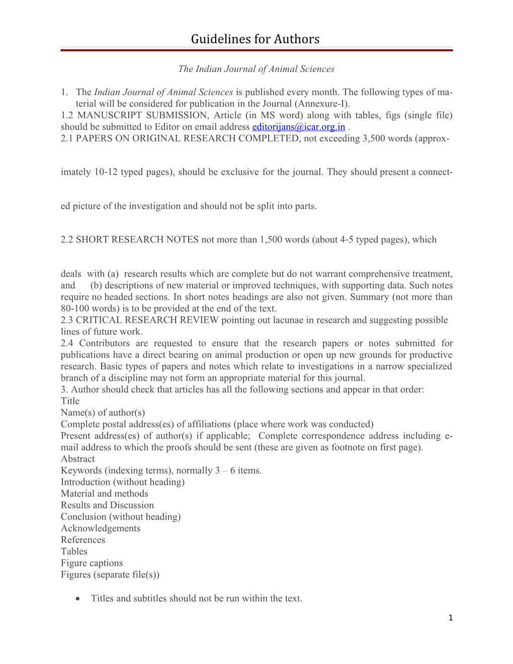 1. The Indian Journal of Animal Sciences is published every month. The following types of ma- terial will be considered for publication in the Journal (Annexure-I). 1.2 MANUSCRIPT SUBMISSION, Article (in MS word) along with tables, figs (single file) should be submitted to Editor on email address [email protected] . 2.1 PAPERS ON ORIGINAL RESEARCH COMPLETED, not exceeding 3,500 words (approx- imately 10‐12 typed pages), should be exclusive for the journal. They should present a connect- ed picture of the investigation and should not be split into parts.