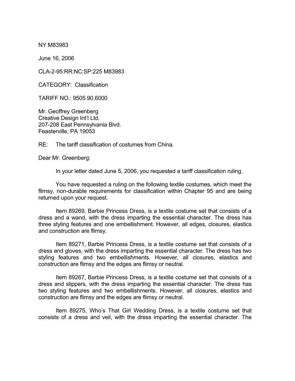 You have requested a ruling on the following textile costumes, which meet the flimsy, non-durable requirements for classification within Chapter 95 and are being returned upon your request.