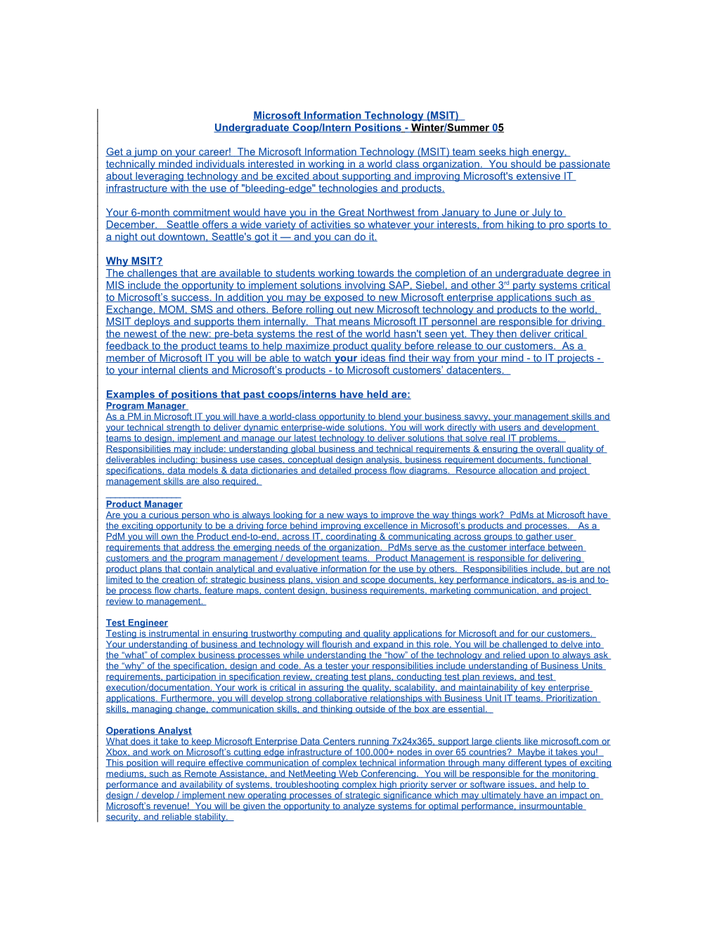 Microsoft Information Technology (MSIT) Undergraduate Coop/Intern Positions - Winter / Summer 0 5