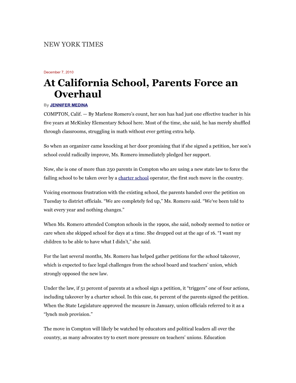 December 7, 2010 At California School, Parents Force an Overhaul By JENNIFER MEDINA COMPTON, Calif. — By Marlene Romero’s count, her son has had just one effective teacher in his five years at McKinley Elementary School here. Most of the time, she said, he has merely shuffled through classrooms, struggling in math without ever getting extra help.