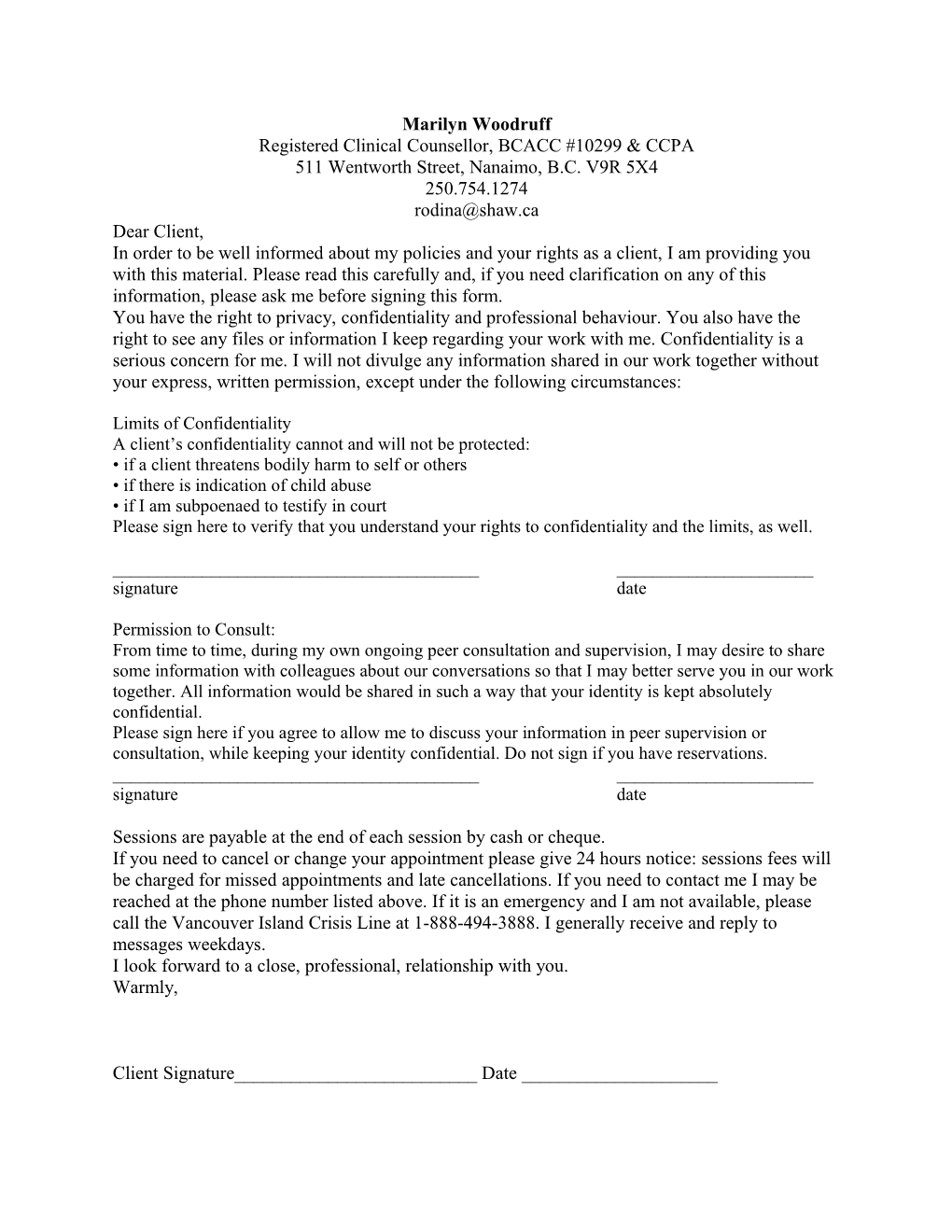 Marilyn Woodruff Registered Clinical Counsellor, BCACC #10299 & CCPA 511 Wentworth Street, Nanaimo, B.C. V9R 5X4 250.754.1274 [email protected] Dear Client, In order to be well informed about my policies and your rights as a client, I am providing you with this material. Please read this carefully and, if you need clarification on any of this information, please ask me before signing this form. You have the right to privacy, confidentiality and professional behaviour. You also have the right to see any files or information I keep regarding your work with me. Confidentiality is a serious concern for me. I will not divulge any information shared in our work together without your express, written permission, except under the following circumstances: