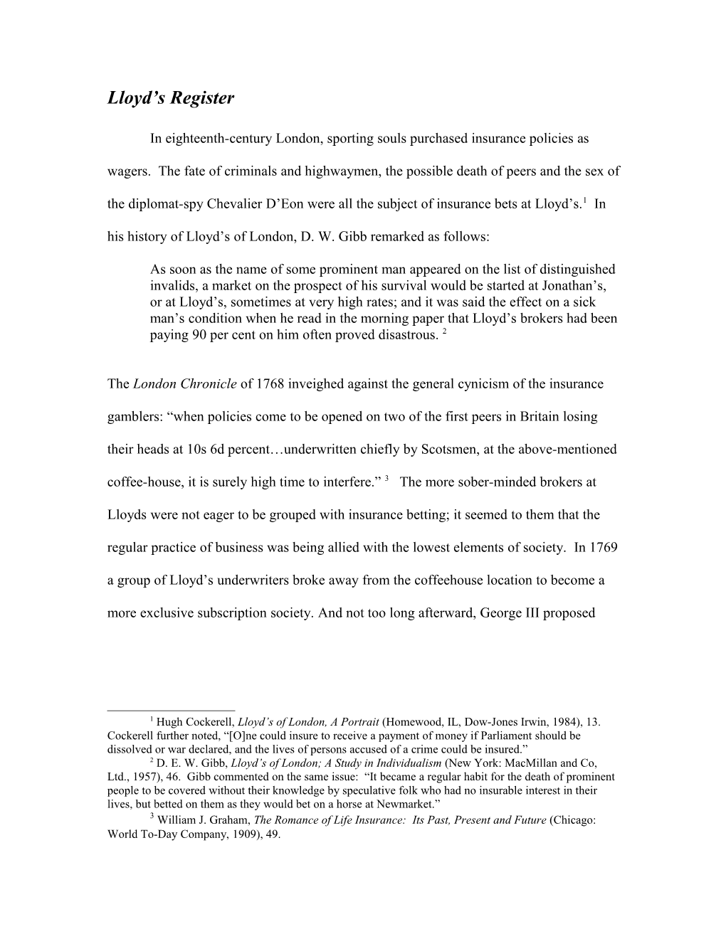 1 Hugh Cockerell, Lloyd’s of London, A Portrait (Homewood, IL, Dow-Jones Irwin, 1984), 13. Cockerell further noted, “[O]ne could insure to receive a payment of money if Parliament should be dissolved or war declared, and the lives of persons accused of a crime could be insured.” 2 D. E. W. Gibb, Lloyd’s of London; A Study in Individualism (New York: MacMillan and Co, Ltd., 1957), 46. Gibb commented on the same issue: “It became a regular habit for the death of prominent people to be covered without their knowledge by speculative folk who had no insurable interest in their lives, but betted on them as they would bet on a horse at Newmarket.” 3 William J. Graham, The Romance of Life Insurance: Its Past, Present and Future (Chicago: World To-Day Company, 1909), 49. statute 14 to the British Parliament, forbidding gambling life insurances.4 Lloyd’s of