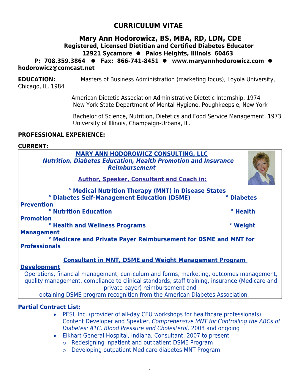 Bachelor of Science, Nutrition, Dietetics and Food Service Management, 1973 University of Illinois, Champaign-Urbana, IL. PROFESSIONAL EXPERIENCE: CURRENT: MARY ANN HODOROWICZ CONSULTING, LLC Nutrition, Diabetes Education, Health Promotion and Insurance Reimbursement A uthor, Speaker, Consultant and Coach in: ° Medical Nutrition Therapy (MNT) in Disease States ° Diabetes Self-Management Education (DSME) ° Diabetes Prevention ° Nutrition Education ° Health Promotion ° Health and Wellness Programs ° Weight Management ° Medicare and Private Payer Reimbursement for DSME and MNT for Professionals