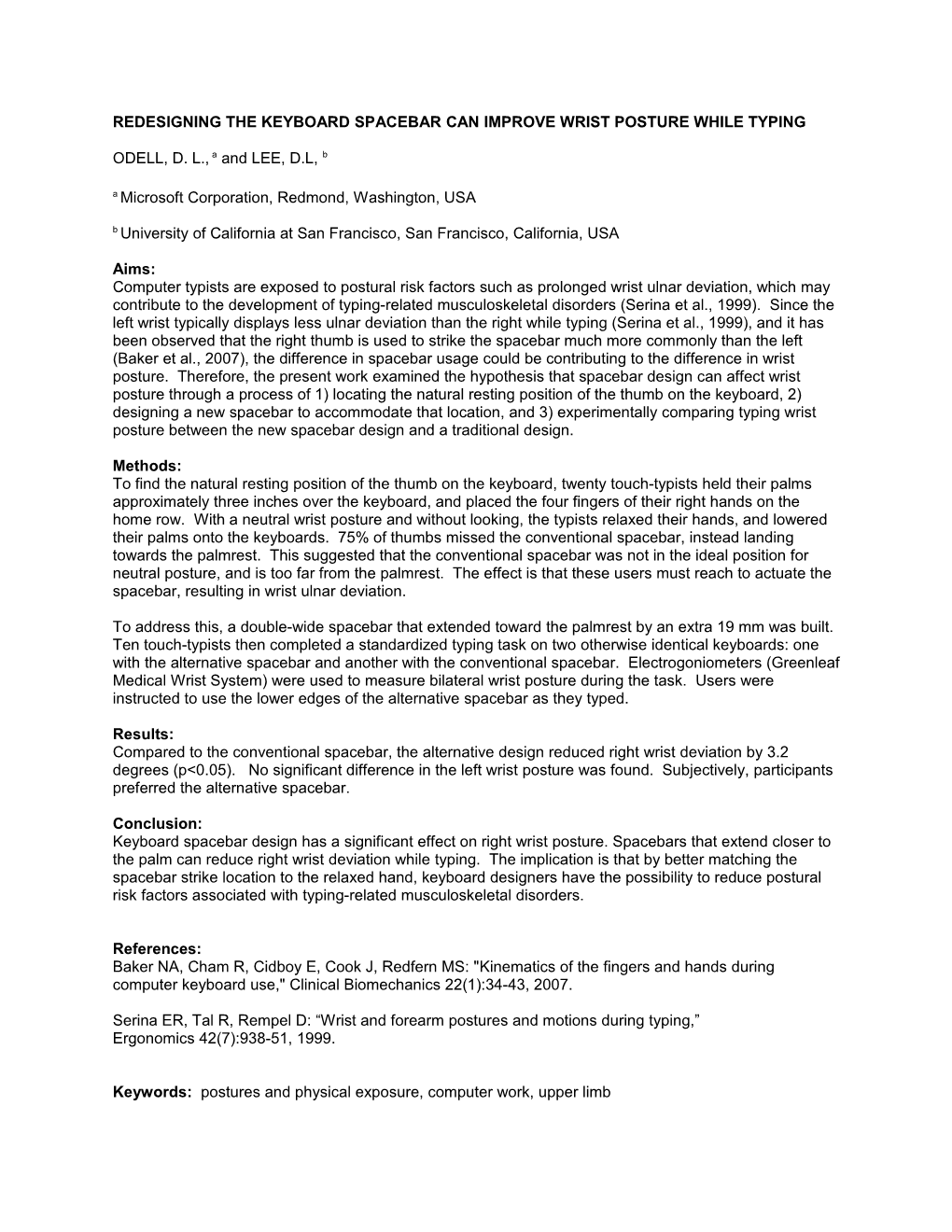 Aims: Computer typists are exposed to postural risk factors such as prolonged wrist ulnar deviation, which may contribute to the development of typing-related musculoskeletal disorders (Serina et al., 1999). Since the left wrist typically displays less ulnar deviation than the right while typing (Serina et al., 1999), and it has been observed that the right thumb is used to strike the spacebar much more commonly than the left (Baker et al., 2007), the difference in spacebar usage could be contributing to the difference in wrist posture. Therefore, the present work examined the hypothesis that spacebar design can affect wrist posture through a process of 1) locating the natural resting position of the thumb on the keyboard, 2) designing a new spacebar to accommodate that location, and 3) experimentally comparing typing wrist posture between the new spacebar design and a traditional design.