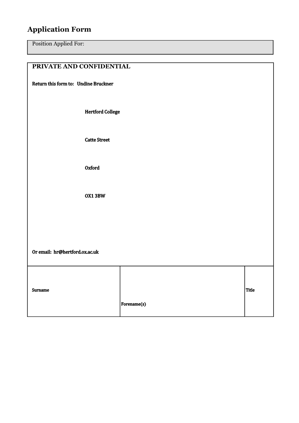 Hertford College is a registered charity, number 1137527 Please include the names and addresses of two persons from whom we may obtain both character and work experience