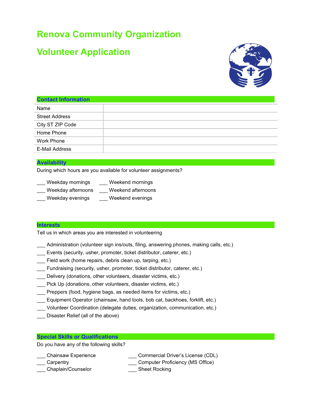 Renova Community Organization Volunteer Application