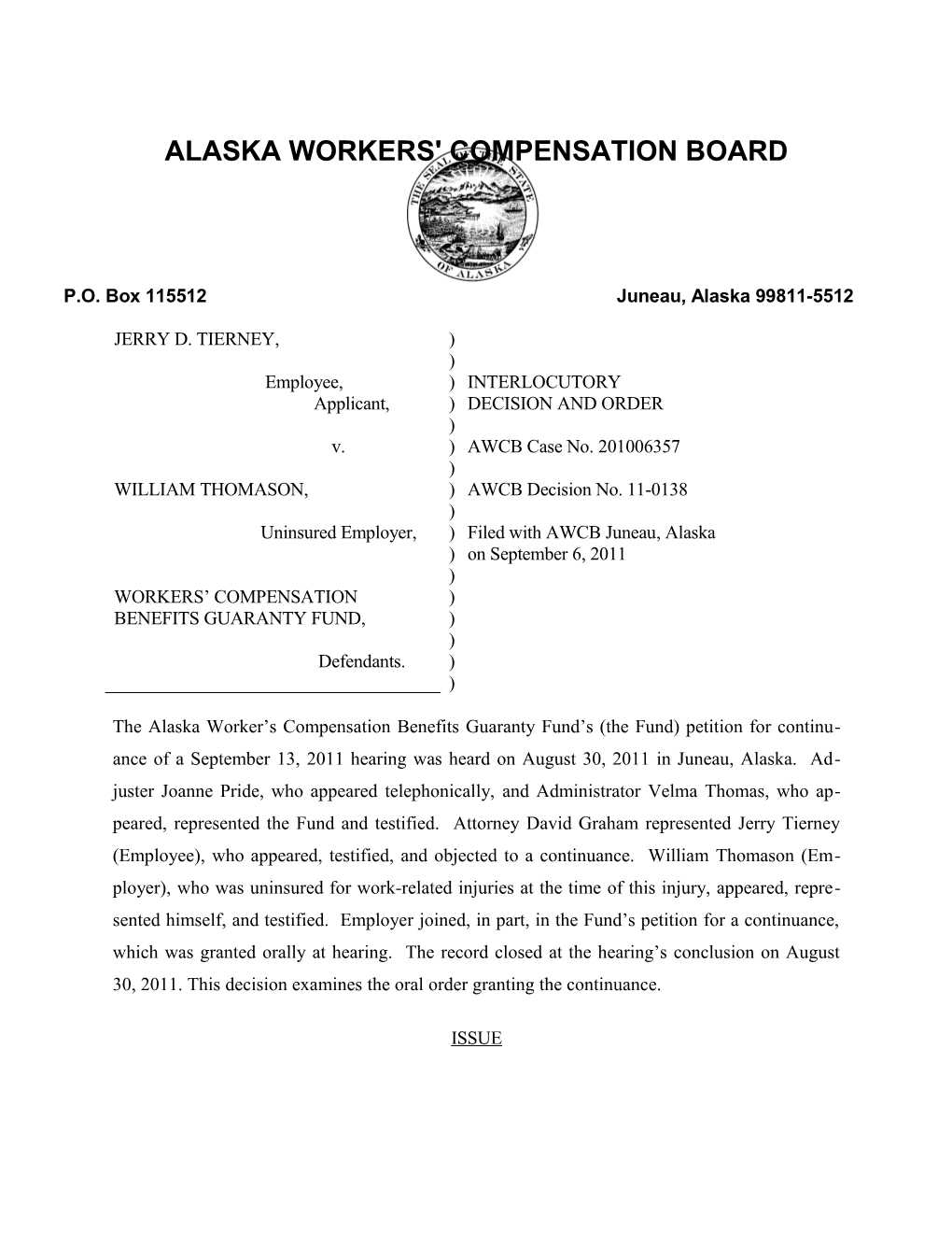 The Alaska Worker’s Compensation Benefits Guaranty Fund’s (the Fund) petition for continu- ance of a September 13, 2011 hearing was heard on August 30, 2011 in Juneau, Alaska. Ad- juster Joanne Pride, who appeared telephonically, and Administrator Velma Thomas, who ap- peared, represented the Fund and testified. Attorney David Graham represented Jerry Tierney (Employee), who appeared, testified, and objected to a continuance. William Thomason (Em- ployer), who was uninsured for work-related injuries at the time of this injury, appeared, repre- sented himself, and testified. Employer joined, in part, in the Fund’s petition for a continuance, which was granted orally at hearing. The record closed at the hearing’s conclusion on August 30, 2011. This decision examines the oral order granting the continuance.