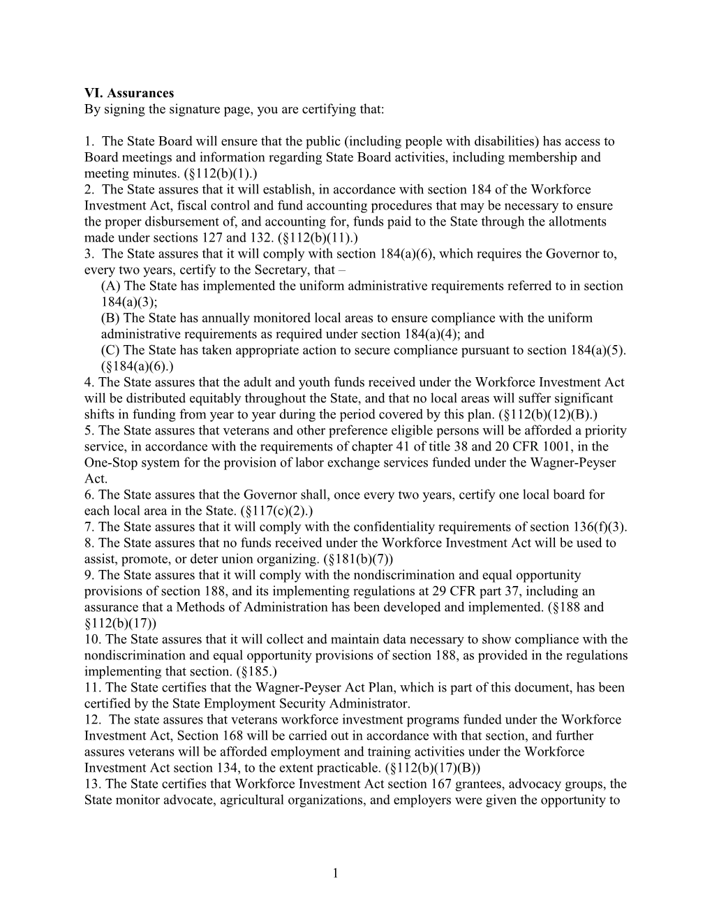 1. The State Board will ensure that the public (including people with disabilities) has access to Board meetings and information regarding State Board activities, including membership and meeting minutes. (§112(b)(1).) 2. The State assures that it will establish, in accordance with section 184 of the Workforce Investment Act, fiscal control and fund accounting procedures that may be necessary to ensure the proper disbursement of, and accounting for, funds paid to the State through the allotments made under sections 127 and 132. (§112(b)(11).) 3. The State assures that it will comply with section 184(a)(6), which requires the Governor to, every two years, certify to the Secretary, that – (A) The State has implemented the uniform administrative requirements referred to in section 184(a)(3); (B) The State has annually monitored local areas to ensure compliance with the uniform administrative requirements as required under section 184(a)(4); and (C) The State has taken appropriate action to secure compliance pursuant to section 184(a)(5). (§184(a)(6).) 4. The State assures that the adult and youth funds received under the Workforce Investment Act will be distributed equitably throughout the State, and that no local areas will suffer significant shifts in funding from year to year during the period covered by this plan. (§112(b)(12)(B).) 5. The State assures that veterans and other preference eligible persons will be afforded a priority service, in accordance with the requirements of chapter 41 of title 38 and 20 CFR 1001, in the One-Stop system for the provision of labor exchange services funded under the Wagner-Peyser Act. 6. The State assures that the Governor shall, once every two years, certify one local board for each local area in the State. (§117(c)(2).) 7. The State assures that it will comply with the confidentiality requirements of section 136(f)(3). 8. The State assures that no funds received under the Workforce Investment Act will be used to assist, promote, or deter union organizing. (§181(b)(7)) 9. The State assures that it will comply with the nondiscrimination and equal opportunity provisions of section 188, and its implementing regulations at 29 CFR part 37, including an assurance that a Methods of Administration has been developed and implemented. (§188 and §112(b)(17)) 10. The State assures that it will collect and maintain data necessary to show compliance with the nondiscrimination and equal opportunity provisions of section 188, as provided in the regulations implementing that section. (§185.) 11. The State certifies that the Wagner-Peyser Act Plan, which is part of this document, has been certified by the State Employment Security Administrator. 12. The state assures that veterans workforce investment programs funded under the Workforce Investment Act, Section 168 will be carried out in accordance with that section, and further assures veterans will be afforded employment and training activities under the Workforce Investment Act section 134, to the extent practicable. (§112(b)(17)(B)) 13. The State certifies that Workforce Investment Act section 167 grantees, advocacy groups, the State monitor advocate, agricultural organizations, and employers were given the opportunity to