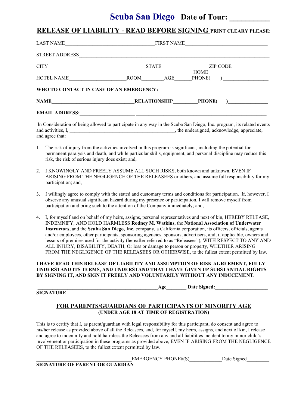 In Consideration of being allowed to participate in any way in the Scuba San Diego, Inc. program, its related events and activities, I, ______, the undersigned, acknowledge, appreciate, and agree that: