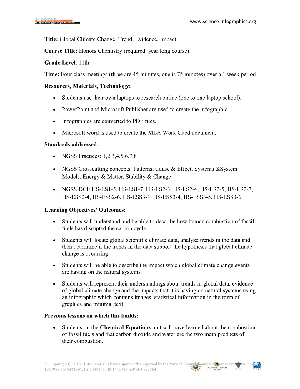 Title: Global Climate Change: Trend, Evidence, Impact Course Title: Honors Chemistry (required, year long course) Grade Level: 11th Time: Four class meetings (three are 45 minutes, one is 75 minutes) over a 1 week period Resources, Materials, Technology: