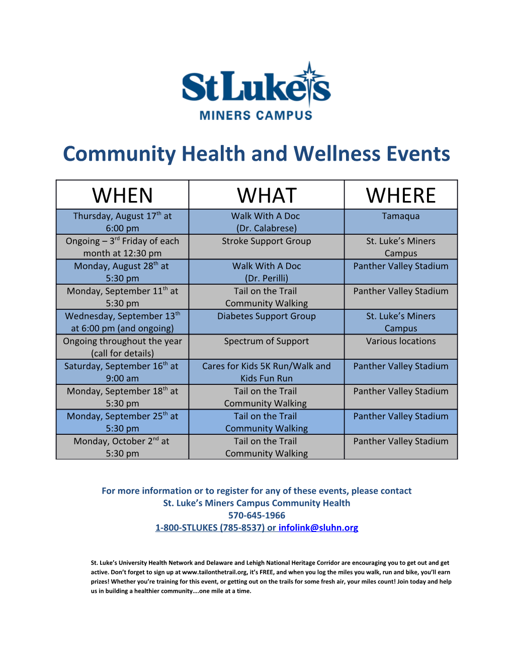 For more information or to register for any of these events, please contact St. Luke’s Miners Campus Community Health 570-645-1966 1-800-STLUKES (785-8537) or [email protected]