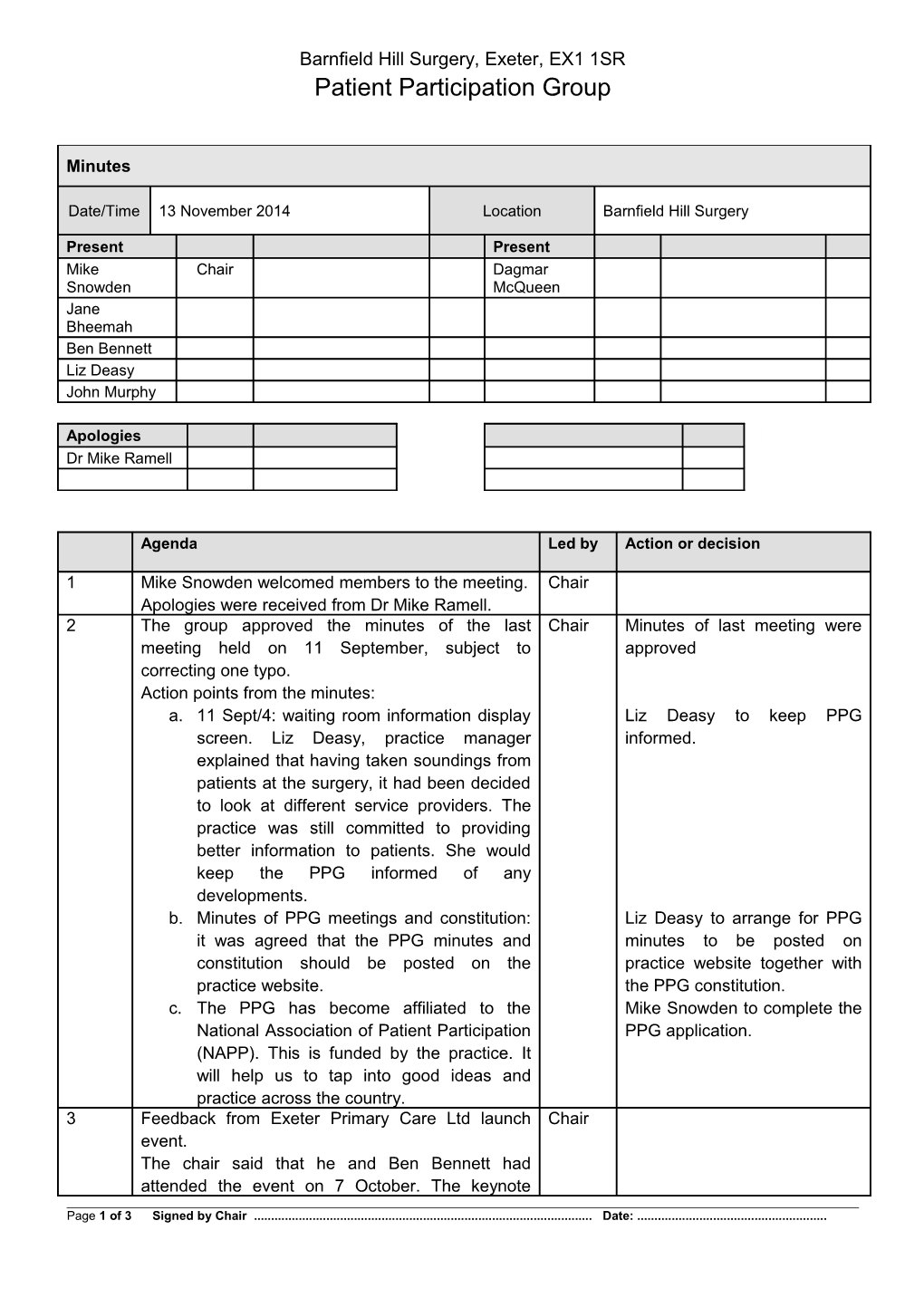 1 Mike Snowden welcomed members to the meeting. Chair Apologies were received from Dr Mike Ramell. 2 The group approved the minutes of the last Chair Minutes of last meeting were meeting held on 11 September, subject to approved correcting one typo. Action points from the minutes: a. 11 Sept/4: waiting room information display Liz Deasy to keep PPG screen. Liz Deasy, practice manager informed. explained that having taken soundings from patients at the surgery, it had been decided to look at different service providers. The practice was still committed to providing better information to patients. She would keep the PPG informed of any developments. b. Minutes of PPG meetings and constitution: Liz Deasy to arrange for PPG it was agreed that the PPG minutes and minutes to be posted on constitution should be posted on the practice website together with practice website. the PPG constitution. c. The PPG has become affiliated to the Mike Snowden to complete the National Association of Patient Participation PPG application. (NAPP). This is funded by the practice. It will help us to tap into good ideas and practice across the country. 3 Feedback from Exeter Primary Care Ltd launch Chair event. The chair said that he and Ben Bennett had attended the event on 7 October. The keynote