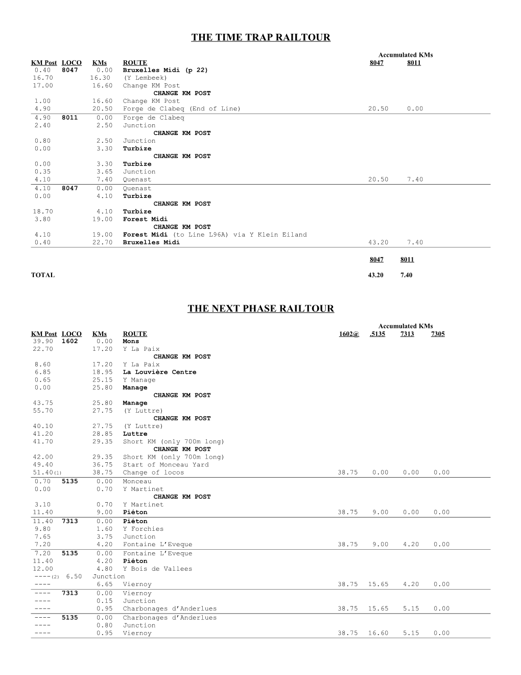 Accumulated KMs KM Post LOCO KMs ROUTE 1602@ .5135 7313 7305 ---- 7313 0.00 Viernoy 12.00 1.85 Y Bois de Vallees 11.40 2.45 Piéton 2.50 11.35 Marchienne Au Pont CHANGE KM POST 52.70 11.35 Marchienne Au Pont 53.30 11.95 Y La Sambre CHANGE KM POST 1.00 11.95 Y La Sambre 0.00 12.95 Y La Sambre Sud CHANGE KM POST 99.40 12.95 Y La Sambre Sud 101.00 14.55 Marchienne Zone 101.30 14.85 Train reversed 38.75 16.60 20.00 0.00 101.30 7305 0.00 Attached 7305 98.90 2.40 La Villette 98.00 3.30 KM 98 7305 removed 38.75 16.60 20.00 3.30 98.00 5135 0.00 KM 98 97.00 1.00 Charleroi Sud 38.75 17.60 20.00 3.30 97.00 1602 0.00 Charleroi Sud 95.80 1.20 L130C Junction CHANGE KM POST 96.00 1.20 L130C Junction (L130C runs past the new shed) 82.10 15.10 Tamines CHANGE KM POST 0.00 15.10 Tamines 5.30(3) 20.40 Aisemont 59.15 17.60 20.00 3.30 5.30 5135 0.00 Aisemont 0.00 5.30 Tamines CHANGE KM POST 82.10 5.30 Tamines 90.20 13.40 Châtelet CHANGE KM POST ----(4) 13.40 ---- 17.90 B.K. 4.500 59.15 35.50 20.00 3.30 ---- 1602 0.00 B.K. 4.500 ---- 4.50 Châtelet 63.65 45.30 20.00 3.30 90.20 5135 0.00 Chârtelet 97.00 6.80 Charleroi Sud 63.65 42.30 20.00 3.30 56.00 1602 0.00 Charleroi Sud 42.00 14.00 Short KM (only 700m long) CHANGE KM POST 41.70 14.00 Short KM (only 700m long) 40.10 15.60 (Y Luttre) CHANGE KM POST 55.70 15.60 (Y Luttre) 43.75 27.55 Manage 32.40 38.90 Y Ecaussines CHANGE KM POST 0.00 38.90 Y Ecaussines 1.30 40.20 Y Soignies CHANGE KM POST 32.40 40.20 Y Soignies 60.30 68.10 Mons 131.75 52.10 20.00 3.30