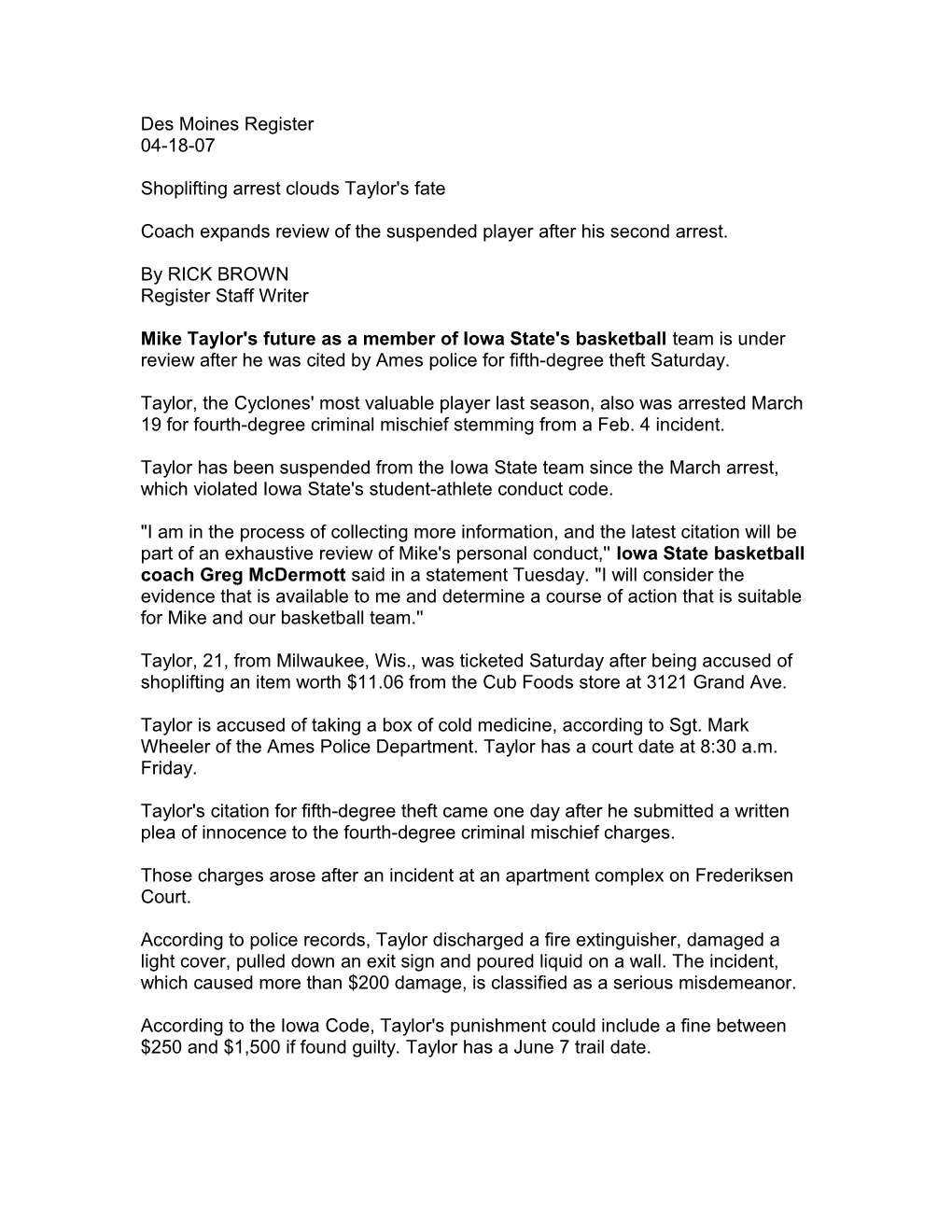 Taylor, the Cyclones' most valuable player last season, also was arrested March 19 for fourth-degree criminal mischief stemming from a Feb. 4 incident.