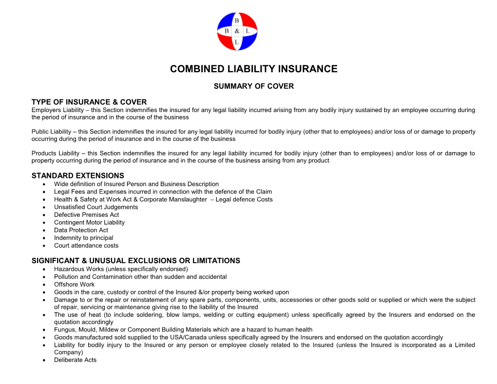 SIGNIFICANT & UNUSUAL EXCLUSIONS OR LIMITATIONS Hazardous Works (unless specifically endorsed) Pollution and Contamination other than sudden and accidental Offshore Work Goods in the care, custody or control of the Insured &/or property being worked upon Damage to or the repair or reinstatement of any spare parts, components, units, accessories or other goods sold or supplied or which were the subject of repair, servicing or maintenance giving rise to the liability of the Insured The use of heat (to include soldering, blow lamps, welding or cutting equipment) unless specifically agreed by the Insurers and endorsed on the quotation accordingly Fungus, Mould, Mildew or Component Building Materials which are a hazard to human health Goods manufactured sold supplied to the USA/Canada unless specifically agreed by the Insurers and endorsed on the quotation accordingly Liability for bodily injury to the Insured or any person or employee closely related to the Insured (unless the Insured is incorporated as a Limited Company) Deliberate Acts Professional Indemnity JCT Clause 21.2.1 or similar clause with same intent Fines, Penalties & Liquidated Damages, Punitive and Exemplary Damages Vessels and Crafts Defamation Terrorism Exception / Limitation Territorial Limits restricted to Great Britain, Channel Islands & Isle of Man, other than for non manual activities