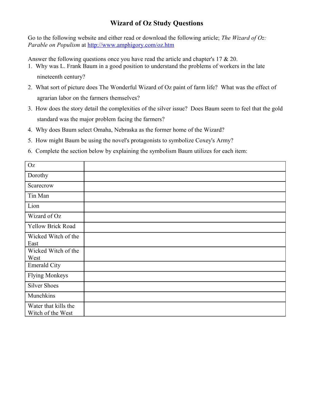 Answer the following questions once you have read the article and chapter's 17 & 20. 1. Why was L. Frank Baum in a good position to understand the problems of workers in the late nineteenth century? 2. What sort of picture does The Wonderful Wizard of Oz paint of farm life? What was the effect of agrarian labor on the farmers themselves? 3. How does the story detail the complexities of the silver issue? Does Baum seem to feel that the gold standard was the major problem facing the farmers? 4. Why does Baum select Omaha, Nebraska as the former home of the Wizard? 5. How might Baum be using the novel's protagonists to symbolize Coxey's Army? 6. Complete the section below by explaining the symbolism Baum utilizes for each item: