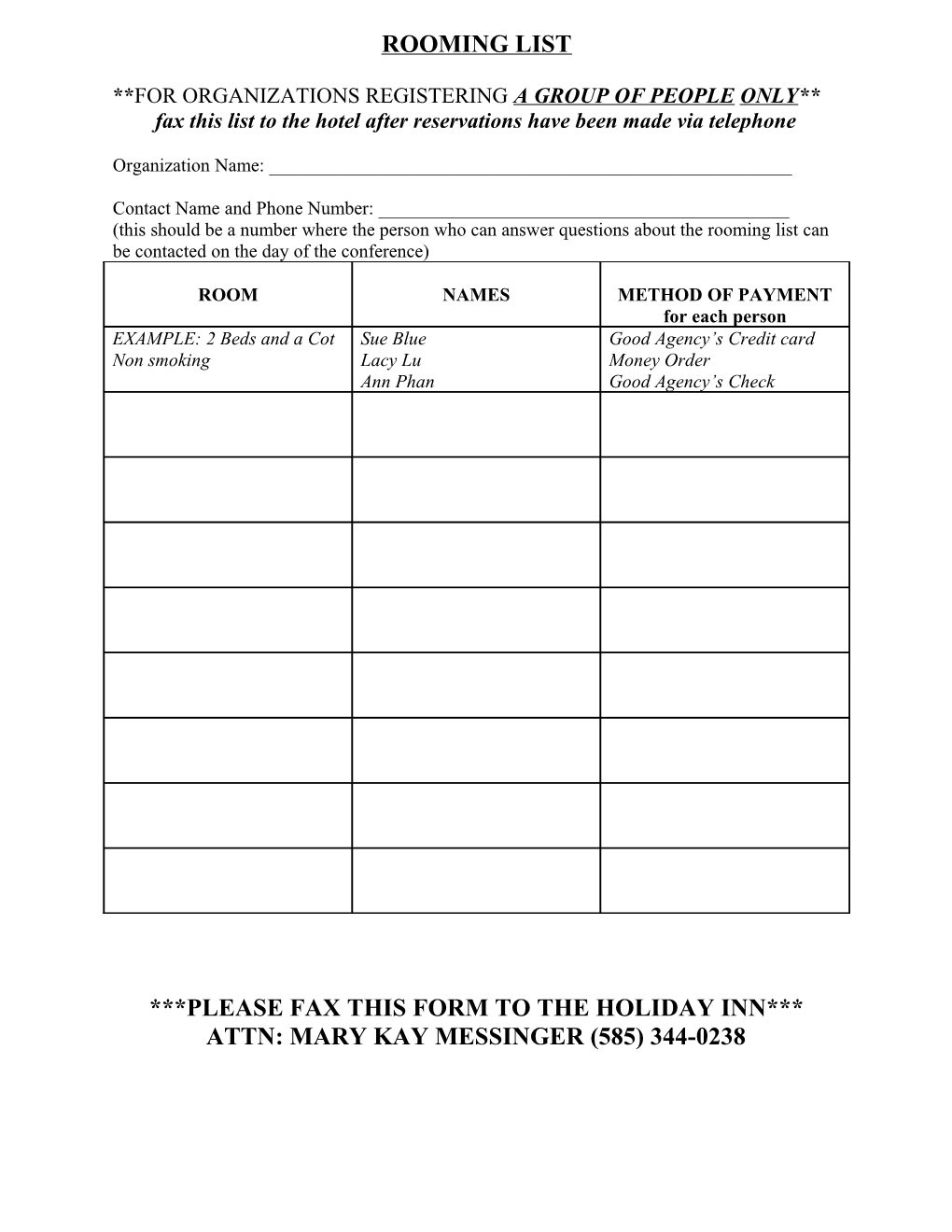 Contact Name and Phone Number: ______(this should be a number where the person who can answer questions about the rooming list can be contacted on the day of the conference)
