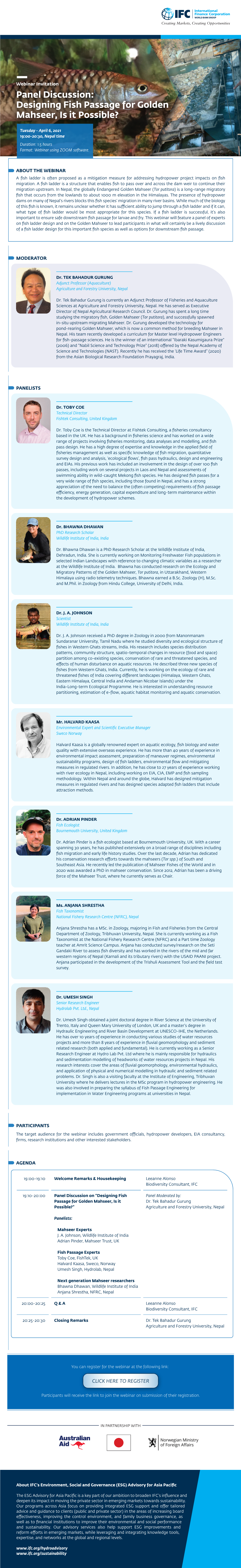 Designing fish passage for golden Mahseer : Is it possible? Kali Gandaki Hydro-dam, Nepal A golden Mahseer (Tor putitora), Nepal Thanks to the International Financing Corporation (World Bank Group) for crafting such an original and interesting topic for discussion today. So, we will learn a great deal, • Focusing on iconic endangered golden Mahseer in relation to the fish passages designing for easy connectivity across the up and down streams. Source: Arun Rana (Arun Rana, holding a catch from Karnali) Source: S Sunuwar, Tor putitora from Arun River Source: Arun Rana (T Limbu holding Mahseer from Seti) Golden Mahseer -- world renounced mega game fish in Himalayan rivers and lakes because of : • Notable size reaching up to 2.75 m (9.0 ft) in length • 54 kg (119 lb) in weight (Froese et. al 2012) • Important to food, nutrition, socio-economic & ecological services to the world. Source: Macdonald (1948) Bombay Natural History Society Fish ladder choked with rockfall, sand and saplings etc (a drought condition in California, source; • Only few fish ladders & lifts are https://seimkuruc.com) successful, mostly failure -- not serving the purpose of their construction. • Largely, due to the inadequate attention on ecological, biological and behavioral requirements of iconic fish during passage designing. Source: Arun Rana Mahseer from Seti) Different types of fish passage General Statement Pool & Weir type fish passage Bonneville Dam US (photo taken from: Denil fish passage theconstructor.org) Vertical slot fish passage (photo by: Larinier) Nature like fish passage (Natural bypass fish passage) Rock & Ramp fish passage (photo by: catchmentsolutions.com.au Fish lift at Safe Harbor Dam (Photo by: Yu Xuezhong) • The golden Mahseer thrive in between 13 - 30 oC, in cool water range, at an elevation from ~100 - 800 masl. -