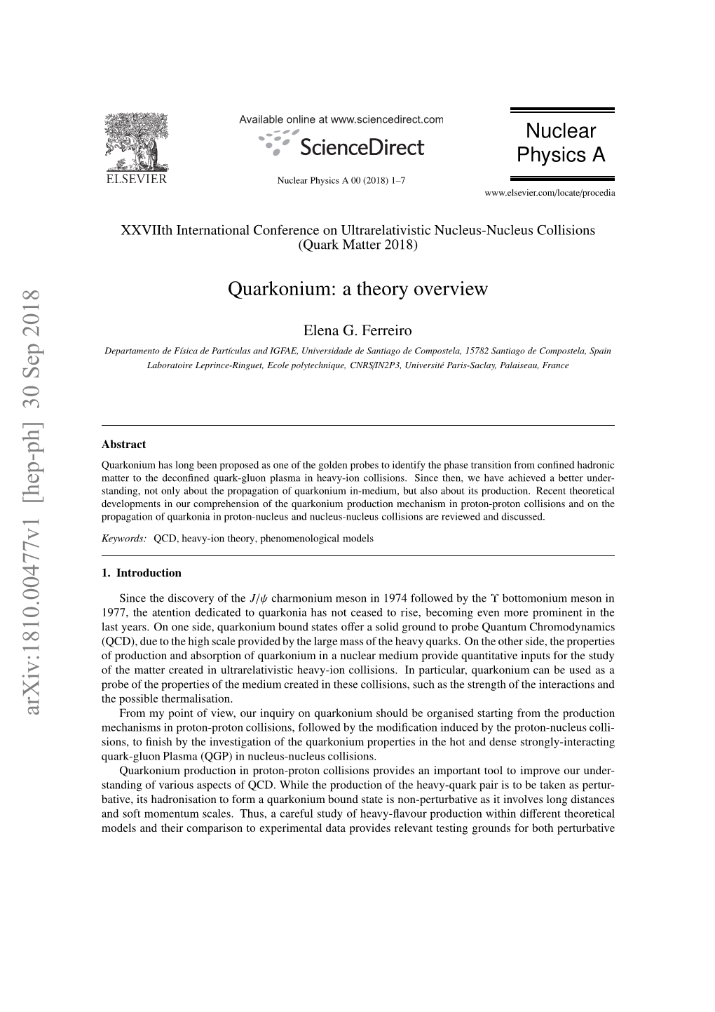 QUARKONIUM TRANSPORT THEORY IN ULTRA-RELATIVISTIC HEAVY-ION COLLISIONS A Dissertation by XIAOJIAN DU Submitted to the Office of Graduate and Professional Studies of Texas A&M University in partial fulfillment of the requirements for the degree of DOCTOR OF PHILOSOPHY Chair of Committee, Ralf Rapp Committee Members, Siu Ah Chin Che-Ming Ko Saskia Mioduszewski Frank Sottile Head of Department, Grigory Rogachev August 2019 Major Subject: Physics Copyright 2019 Xiaojian Du ABSTRACT The study of the fundamental strong interaction is an important vehicle for advancing our understanding of nuclear physics. Quarkonia, bound states of heavy quark-antiquark pairs, are promising probes for studying the strong force, in particular its confining prop- erty which constrains quarks and gluons to hadrons. Ultrarelativistic heavy-ion collisions (URHICs) are the only experimental method that can screen the strong force by creating a hot and dense medium. The suppression of quarkonia observed in URHICs is believed to be due to the formation of a deconfined quark-gluon plasma (QGP), a medium with un- bound quarks and gluons. In order to study this phenomenon, we utilize a transport model to describe the evolution of quarkonium states in URHICs. This model calculates the sup- pression of heavy quarkonia, as well as recombination of heavy quark-antiquark pairs, in the medium. For charmonium, in particular, the recombination is essential for describing the momentum and energy dependencies of their spectra. Based on the fact that different binding energies lead to different dissociation temperatures, a “sequential regeneration” of excited and ground-state charmonia is proposed and implemented to compare to experi- mental data in nuclear collisions. -