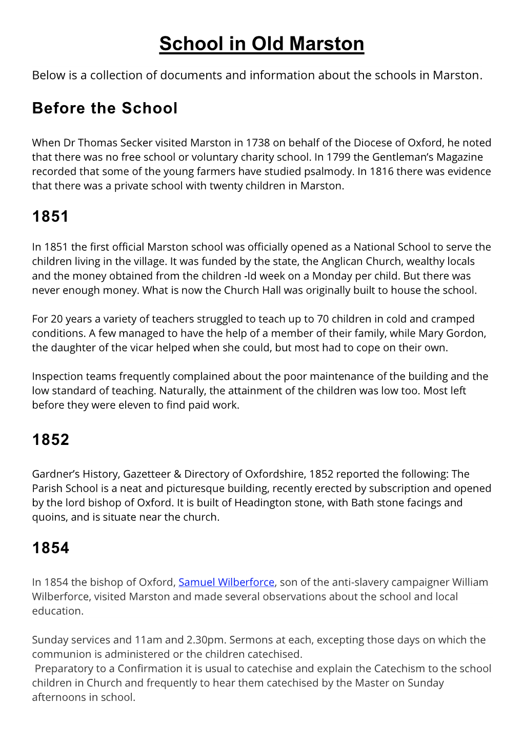 Timeline of Marston Below is a brief timeline of the history of Marston courtesy of Stephanie Jenkins of headington.org.uk. There have been two Palaeolithic finds in Marston, but the Romans do not appear to have had a BC settlement there AD 1086 Domesday Book: Marston (then a hamlet of Headington) was too small to be mentioned Until this time, all the low ground of Marston is believed to have been under water. Old Marston village AD 1100 was now an island in the Cherwell. It had its own chapel, which was dependent on Headington. It was part of the Royal Manor at Headington (which also owned Binsey and Osney). First written occurrence of the name of Marston. Its chapel is referred to as a church for the first time, and by the end of the twelfth century it was dedicated to St Nicholas. Henry I gave the chapel of Marston to the canons of St. Frideswide’s. AD 1122 The chancel arch and seven arches of the nave survive which suggests a considerable community cultivating surrounding fields – workable by ditching and draining. The tenant had rights of commoning cattle and cutting furze, fern and dead wood. In this year the population of Marston consisted of the Vicar, two freeholders (the miller and a man appearing to live at Court Place) and 46 unfree tenants. First mention of a Marston ferry. Hugh de Molendino held a mill at Marston. (Hundred Rolls). There was a mill at the end of Mill Lane near Sescut Farm which would disappear and re-appear in the AD 1279 records up to the 1400s. -