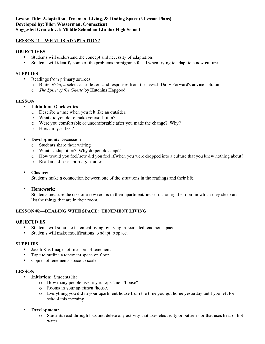 Adaptation, Tenement Living, & Finding Space (3 Lesson Plans)