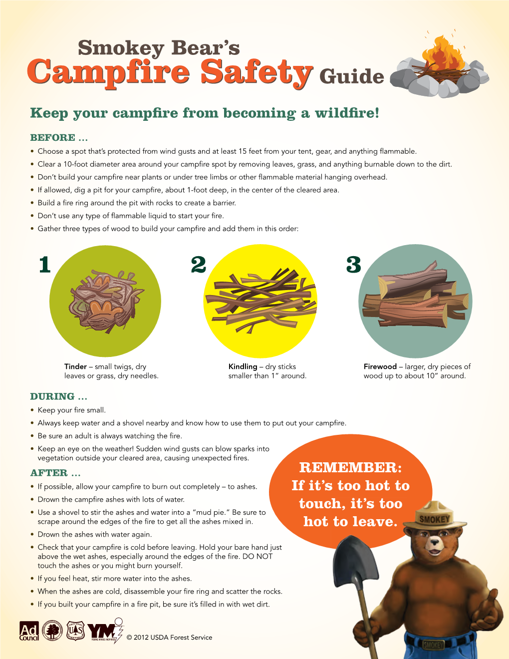 Smokey Bear’s Guide Keep your campfire from becoming a wildfire! BEFORE … • Choose a spot that’s protected from wind gusts and at least 15 feet from your tent, gear, and anything flammable. • Clear a 10-foot diameter area around your campfire spot by removing leaves, grass, and anything burnable down to the dirt. • Don’t build your campfire near plants or under tree limbs or other flammable material hanging overhead. • If allowed, dig a pit for your campfire, about 1-foot deep, in the center of the cleared area. • Build a fire ring around the pit with rocks to create a barrier. • Don’t use any type of flammable liquid to start your fire. • Gather three types of wood to build your campfire and add them in this order: 1 2 3 Tinder – small twigs, dry Kindling – dry sticks Firewood – larger, dry pieces of leaves or grass, dry needles. smaller than 1” around. wood up to about 10” around. DURING … • Keep your fire small. • Always keep water and a shovel nearby and know how to use them to put out your campfire. • Be sure an adult is always watching the fire. • Keep an eye on the weather! Sudden wind gusts can blow sparks into vegetation outside your cleared area, causing unexpected fires. AFTER … REMEMBER: • If possible, allow your campfire to burn out completely – to ashes. If it’s too hot to • Drown the campfire ashes with lots of water. touch, it’s too • Use a shovel to stir the ashes and water into a “mud pie.” Be sure to scrape around the edges of the fire to get all the ashes mixed in. -