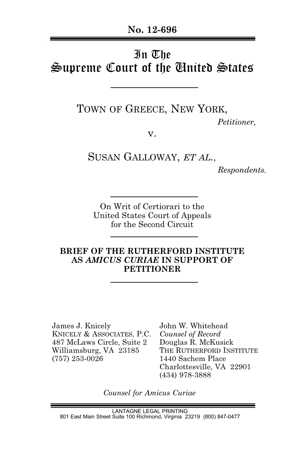 No. 08-1521 1Jn '!tbt ~upreme ((ourt of tbe Wntteb ~tate5 OTIS MCDONALD, ET AL., Petitioners, v. CITY OF CHICAGO, Respondent. On Writ of Certiorari to the United States Court of Appeals for the Seventh Circuit AMICUS CURIAE BRIEF OF THE RUTHERFORD INSTITUTE IN SUPPORT OF PETITIONERS John W. Whitehead Counsel of Record Douglas R. McKusick John M. Beckett THE RUTHERFORD INSTITUTE 1440 Sachem Place Charlottesville, VA 22901 (434) 978-3888 LANTAGNE LEGAL PRINTING BOl East Main Street Suite 100 Richmond, Virginia 23219 (BOO) B47-0477 i TABLE OF CONTENTS TABLE OF CONTENTS ..............................................i TABLE OF AUTHORITIES........................................ii QUESTION PRESENTED..........................................1 INTEREST OF AMICUS CURIAE.............................1 STATEMENT OF FACTS ...........................................2 SUMMARY OF ARGUMENT .....................................2 ARGUMENT................................................................4 I. The Right To Bear Arms Is A Fundamental Right of All Americans Guaranteed By The Fourteenth Amendment And Applies Equally To The States And The Federal Government. .............4 CONCLUSION ..........................................................14 ii TABLE OF AUTHORITIES Cases Bach v. Pataki, 408 F.3d 75 (2d Cir. 2005), cert. denied, 546 U.S. 1174 (2006). ..................................8 Benton v. Maryland, 395 U.S. 784 (1969)...............6, 7 Duncan v. Louisiana, 391 U.S. 145 (1968) .................7 Gardner v. Vespia, 252 F.3d 500 (1st Cir. 2001) .........8 Heller v. District of Columbia, 128 S.Ct. 2783 (2008) ........................................................................ passim Love v. Pepersack, 47 F.3d 120 (4th Cir. 1995)............8 Malloy v. Hogan, 378 U.S. 1 (1964) ............................7 Marbury v. Madison, 5 U.S. (1 Cranch) 137 (1803) .10 National Rifle Ass’n of America, Inc. v. City of Chicago, 567 F.3d 856 (7th Cir. 2009)..................5, 8 Nordyke v. -