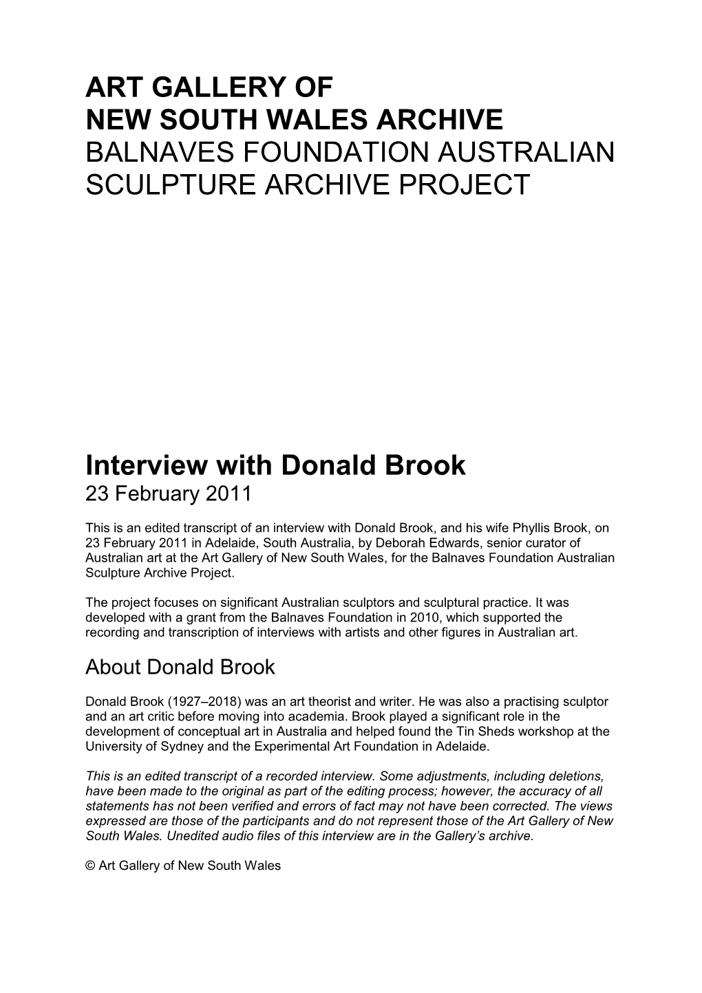Heather Barker and Charles Green, Flight from the Object: Donald Brook, Inhibodress and the Emergence of Post-Studio Art in Early 1970s Sydney HEATHER BARKER AND CHARLES GREEN Flight from the Object: Donald Brook, Inhibodress and the Emergence of Post-Studio Art in Early 1970s Sydney ABSTRACT In the early 1970s, within the small art worlds of Melbourne and Sydney, the contributions of art theorist Donald Brook were as crucial to the innovation of Conceptual art as the art itself. He was an important, prescient but ultimately lonely participant in these developments, as were artists Peter Kennedy and Mike Parr, and alternative Sydney galleries Inhibodress and the University of Sydney workshop, Tin Sheds. Brook considered that national identity was irrelevant in art; was resolutely concerned with art but not at all concerned with “Australian art”. He was opposed to a methodology that excluded everything that did not fit into a preconceived and often teleological system, insisting that if a theory could not account for post-object art then the theory was flawed and not the art. While conceding that there may have been a basis for claims that post- object art was ‘simply not art’, he criticised conservatives for resisting post-object art, insisting that the issue was still to be argued. Introduction This essay examines the turn away from defensive nationalism to internationalist autobiography in the art and theories of contemporary art during the early 1970s. It is paradoxical that this turn occurred in the process of young artists’ disillusionment with an art movement that was the most truly globalised and the least tainted by nationalism or provincialism – Conceptual art. -