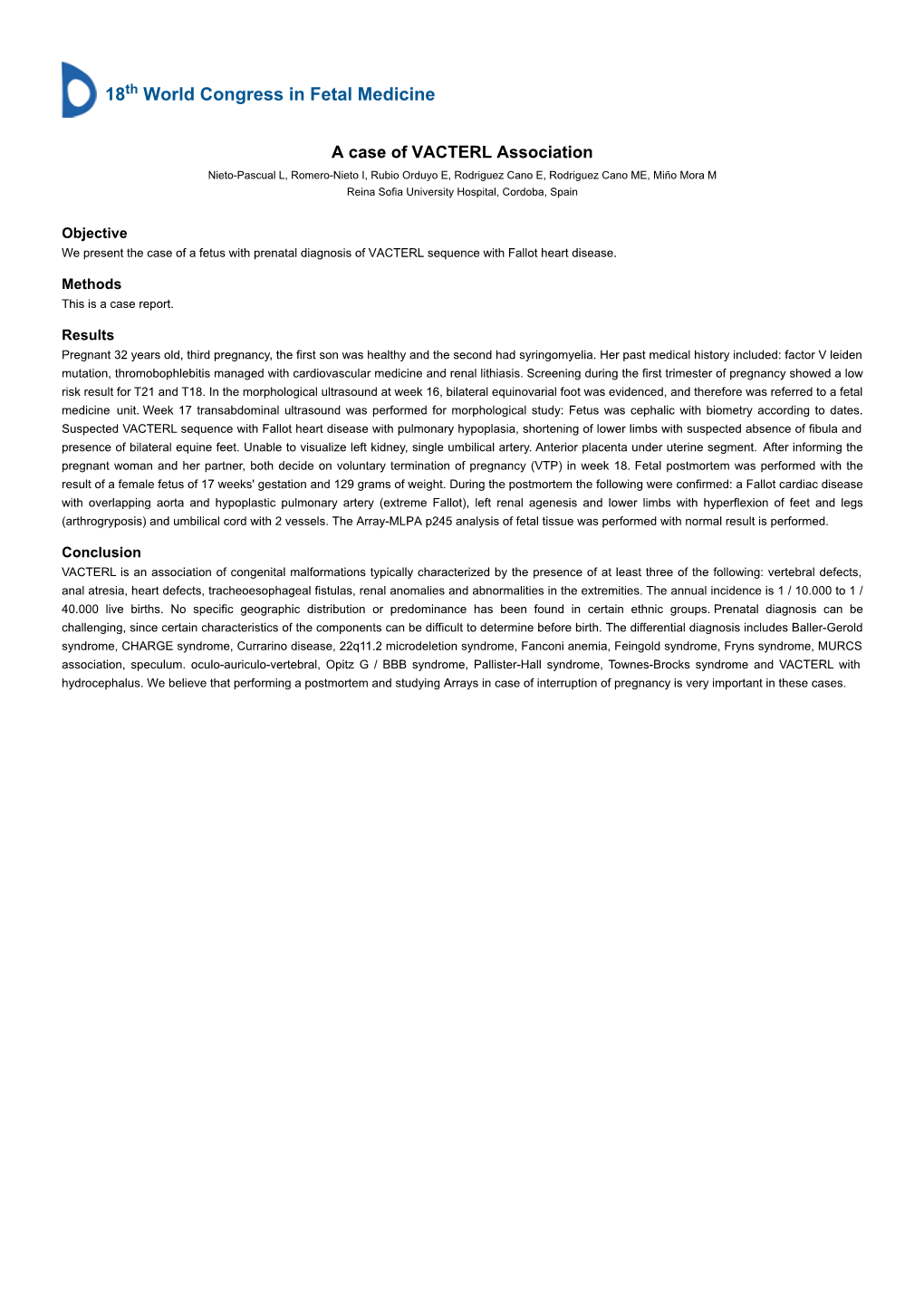 Nascer e Crescer - Birth and Growth Medical Journal NASCER E CRESCER 2020;29(1): 51-55. doi:10.25753/BirthGrowthMJ.v29.i1.14036 BIRTH AND GROWTH MEDICAL JOURNAL year 2020, vol XXIX, n.º 1 CASE REPORTS ULTRASOUND RELEVANCE IN PRENATAL DIAGNOSIS OF VACTERL ASSOCIATION – TWO CLINICAL CASES A IMPORTÂNCIA DA ECOGRAFIA NO DIAGNÓSTICO PRÉ-NATAL DA ASSOCIAÇÃO VACTERL – DOIS CASOS CLÍNICOS Joana FélixI, Joana Moreira BarrosI, Ana Rita SoaresII, Fátima SoaresI, Rosete NogueiraIII,IV, Pedro Tiago SilvaI ABSTRACT VATER is a nonrandom association of congenital defects with common developmental pathogenesis including/which includes malformations like vertebral defects, anal atresia or imperforate anus, tracheoesophageal fistula with esophageal atresia, and radial or renal dysplasia. VATER acronym was initially used to describe this association, but other malformations, like cardiac defects and limb anomalies, were later also considered cardinal features and included, changing the acronym to VACTERL. Although few cases have been reported, VATER/VACTERL spectrum association can be detected in first-trimester ultrasound. Herein, the authors describe two cases of VATER/VACTERL association suspected during the 12-week ultrasound and confirmed in anatomopathological study. Prenatal VACTERL association diagnosis is challenging and rarely detected in the first pregnancy trimester. It requires skill and experience to interpret ultrasound findings and some features are difficult to recognize before birth. Early diagnosis is important for parental counselling and delivery planning. Management options include medical pregnancy termination and delivery in a tertiary center to improve outcomes. Keywords: fetal malformations; fetal ultrasound; prenatal diagnosis; VACTERL association RESUMO VATER é uma associação não aleatória de defeitos congénitos associados com patogénese comum. -